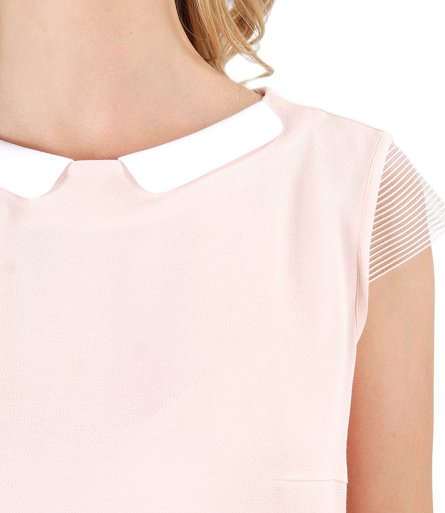 Bluza eleganta din viscoza, cu maneca scurta din elastic transparent si doua gulere pe fata si pe spate. Se inchide cu fermoar ascuns pe mijloc spate.