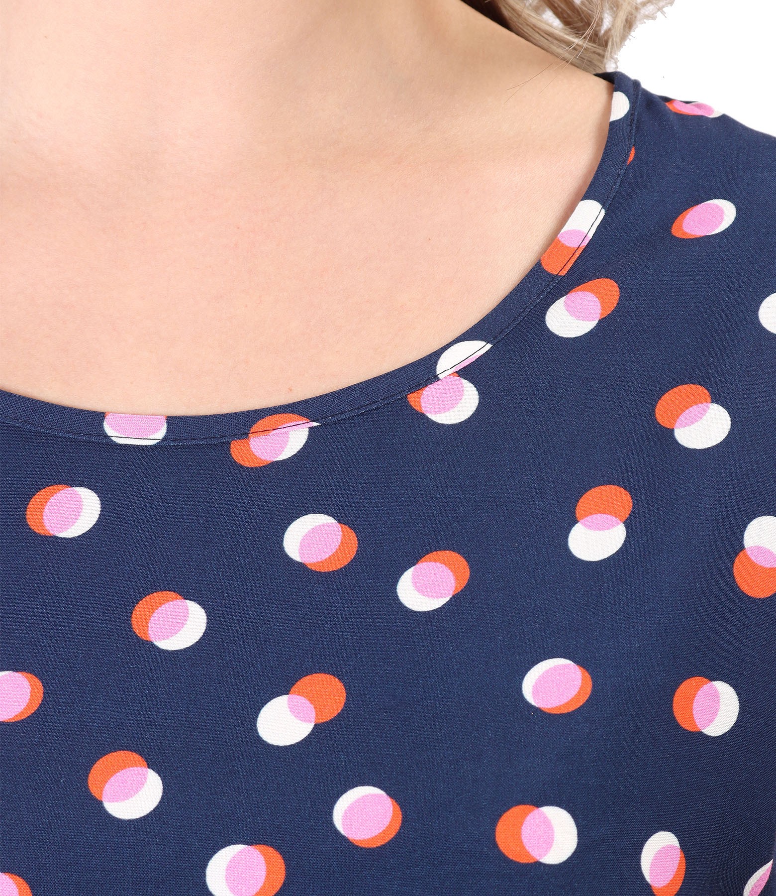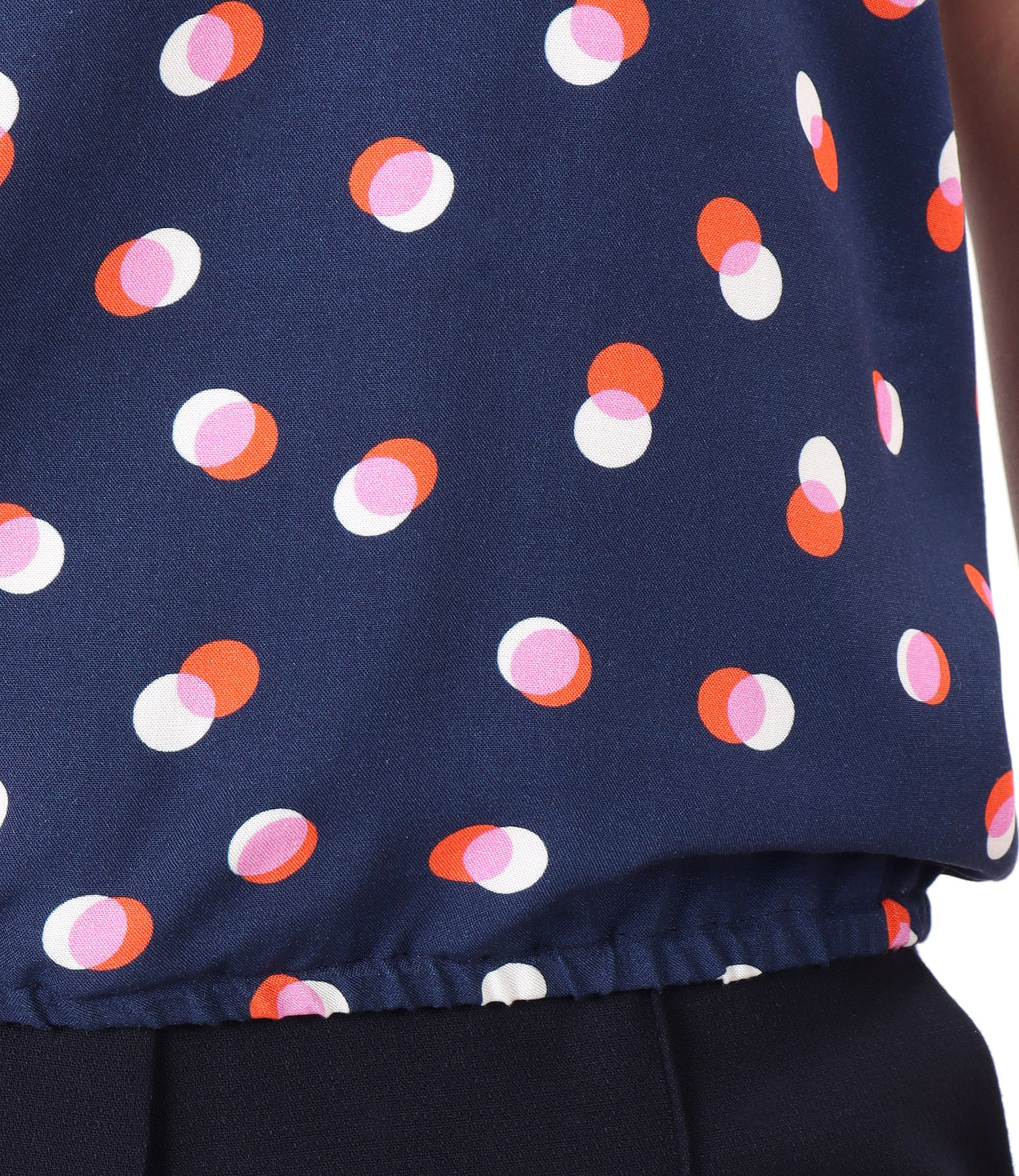 Bluza din viscoza impimata digital cu buline, cu decolteu rotund, maneci cazute si elastic la terminatie.