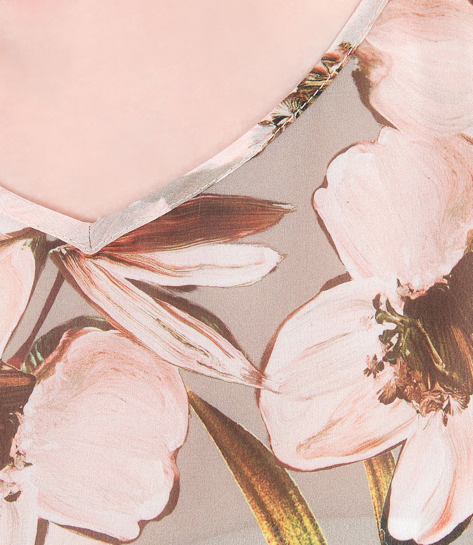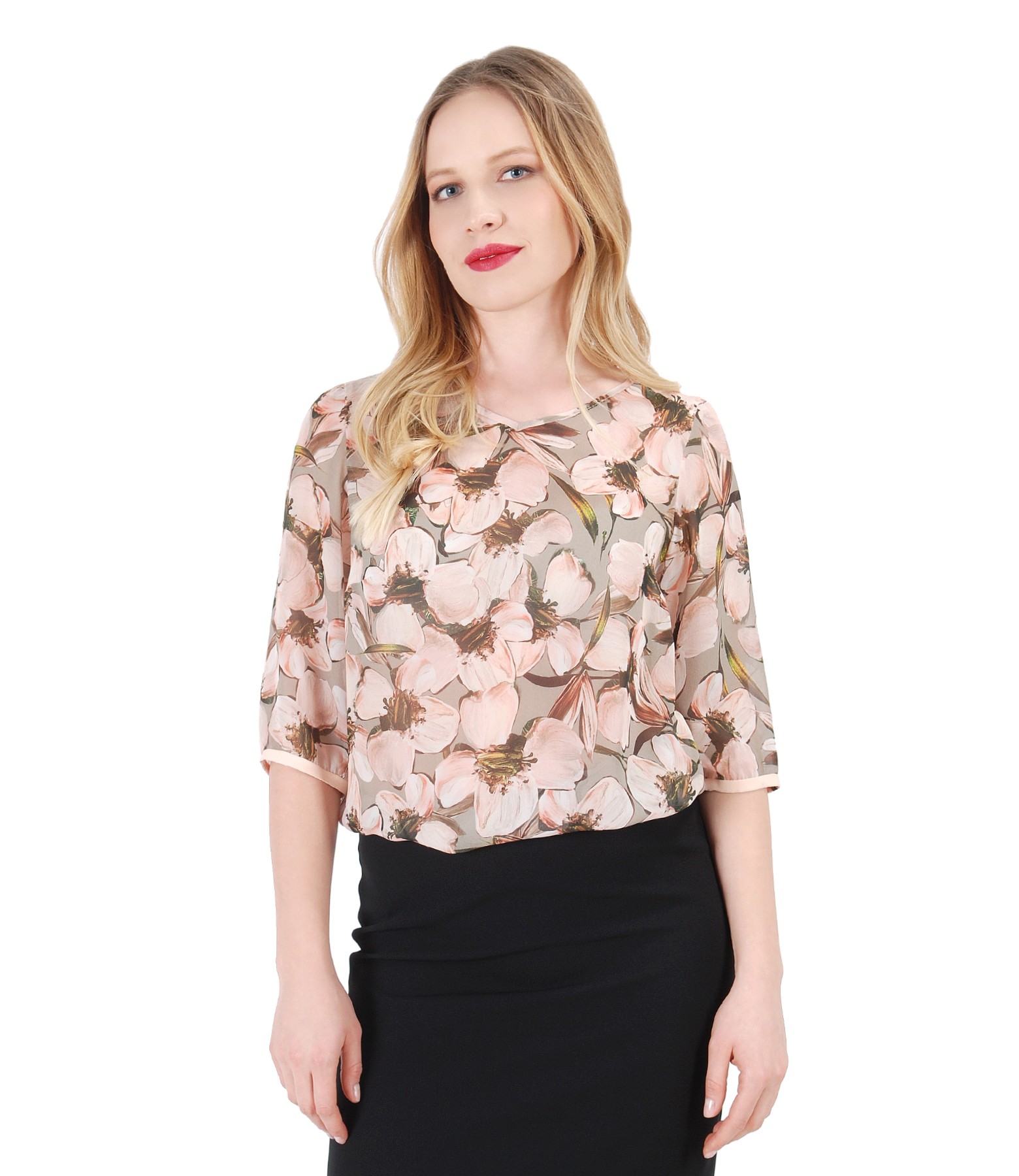 Bluza eleganta din viscoza imprimata cu flori, cu maneci 3/4 si decolteu in V. Nu are sistem de inchidere.
