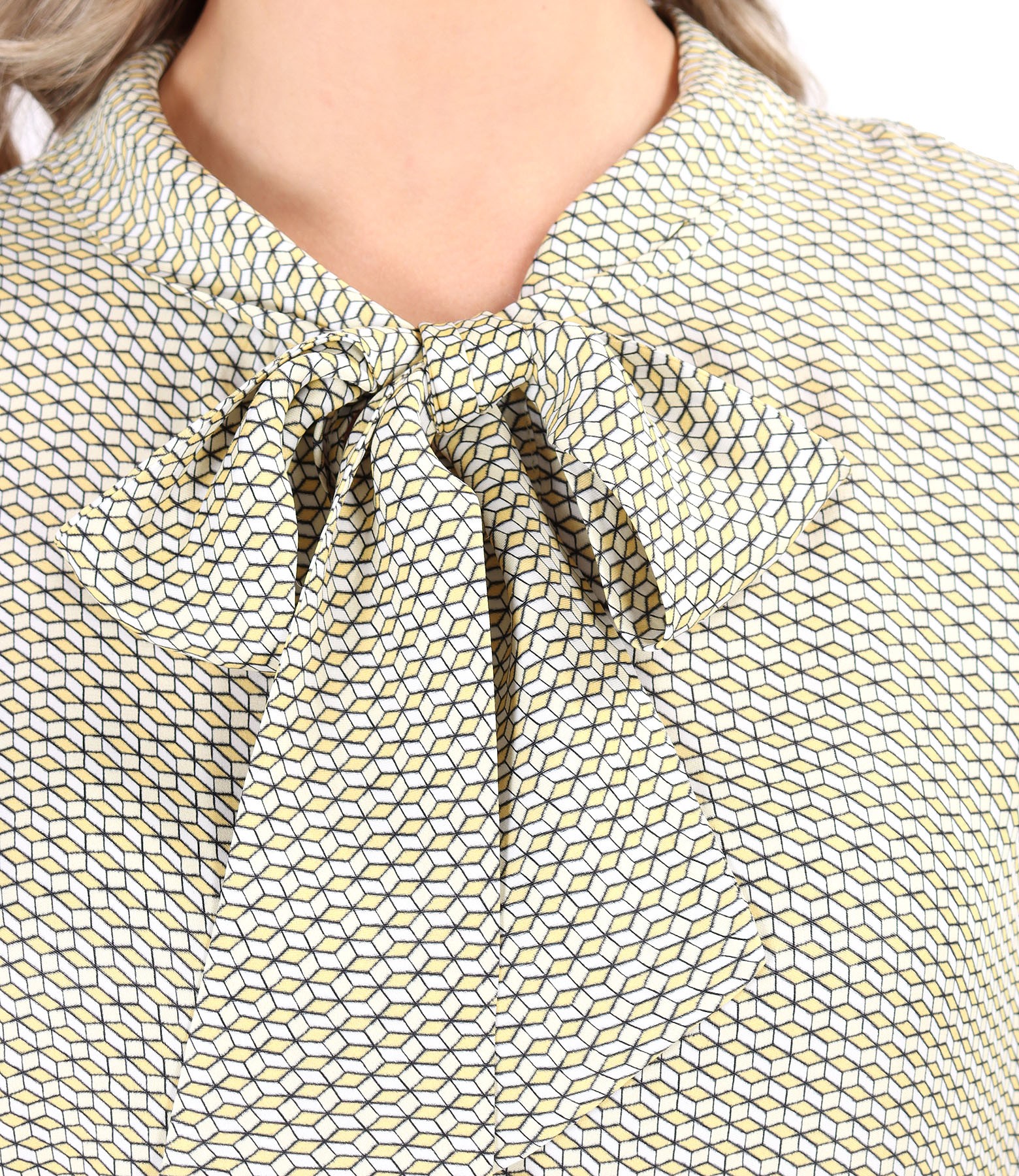 Bluza eleganta din viscoza imprimata digital cu motive geometrice, cu guler gen esarfa si maneci scurte.