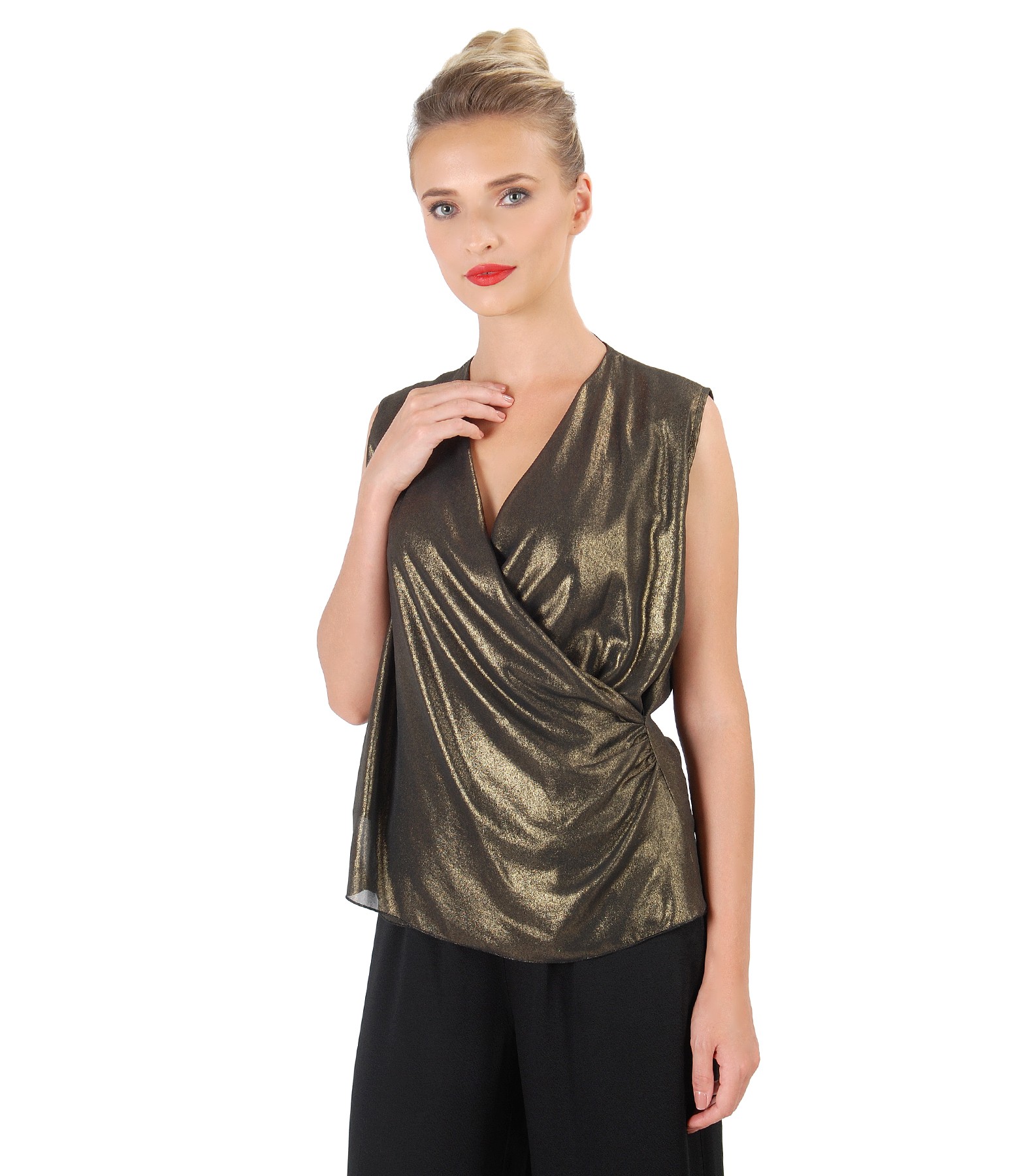 Bluza eleganta din voal cu efect sidefat, dublata cu viscoza pe fata, fara maneci si cu pieptii petrecuti. Nu are sistem de inchidere.