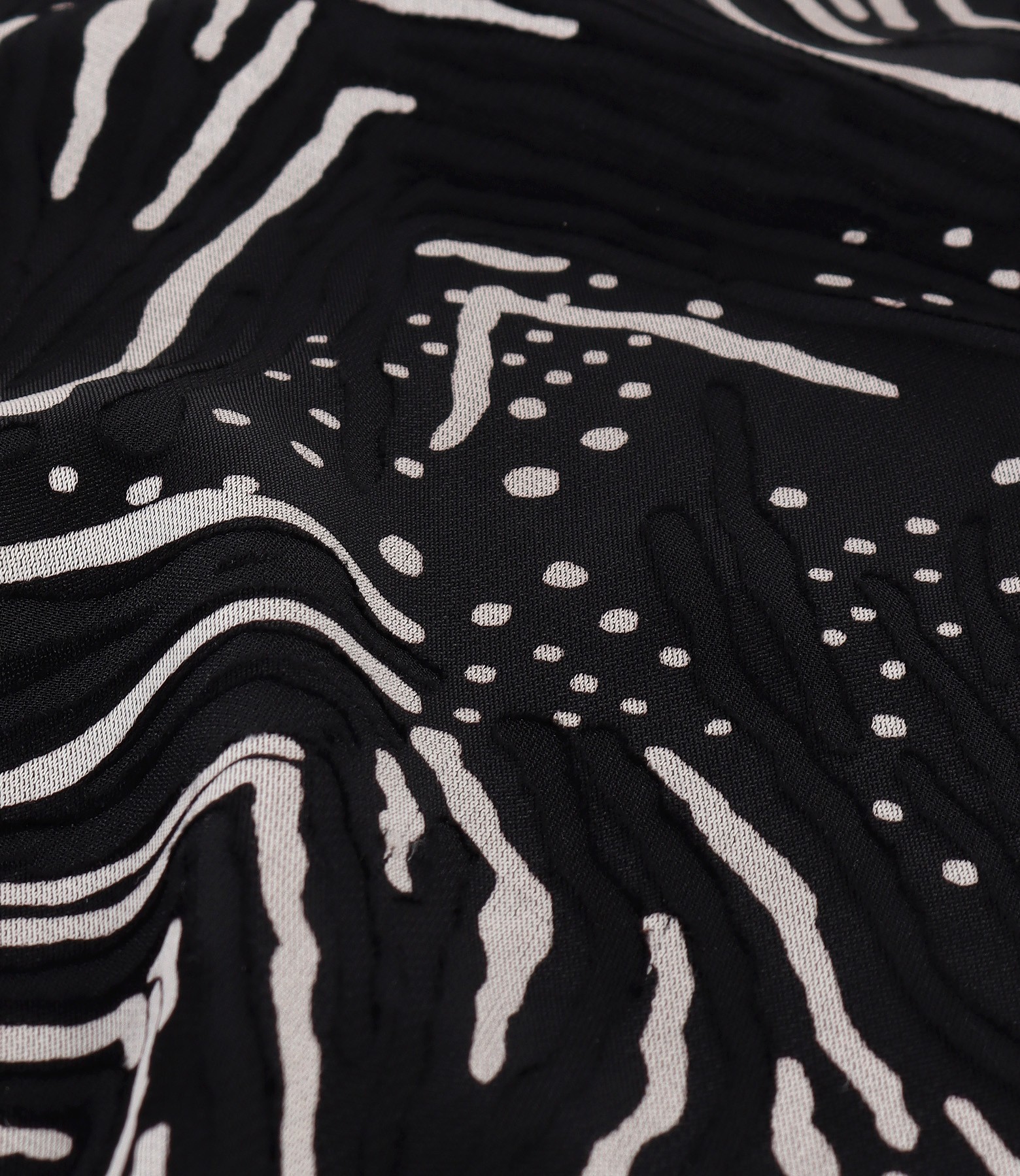 Bluza eleganta din voal cu motive satinate, cu maneci lungi cu elastic, cu decolteu rotund si terminatie elastica in talie. Se inchide cu un nasture pe mijloc spate.