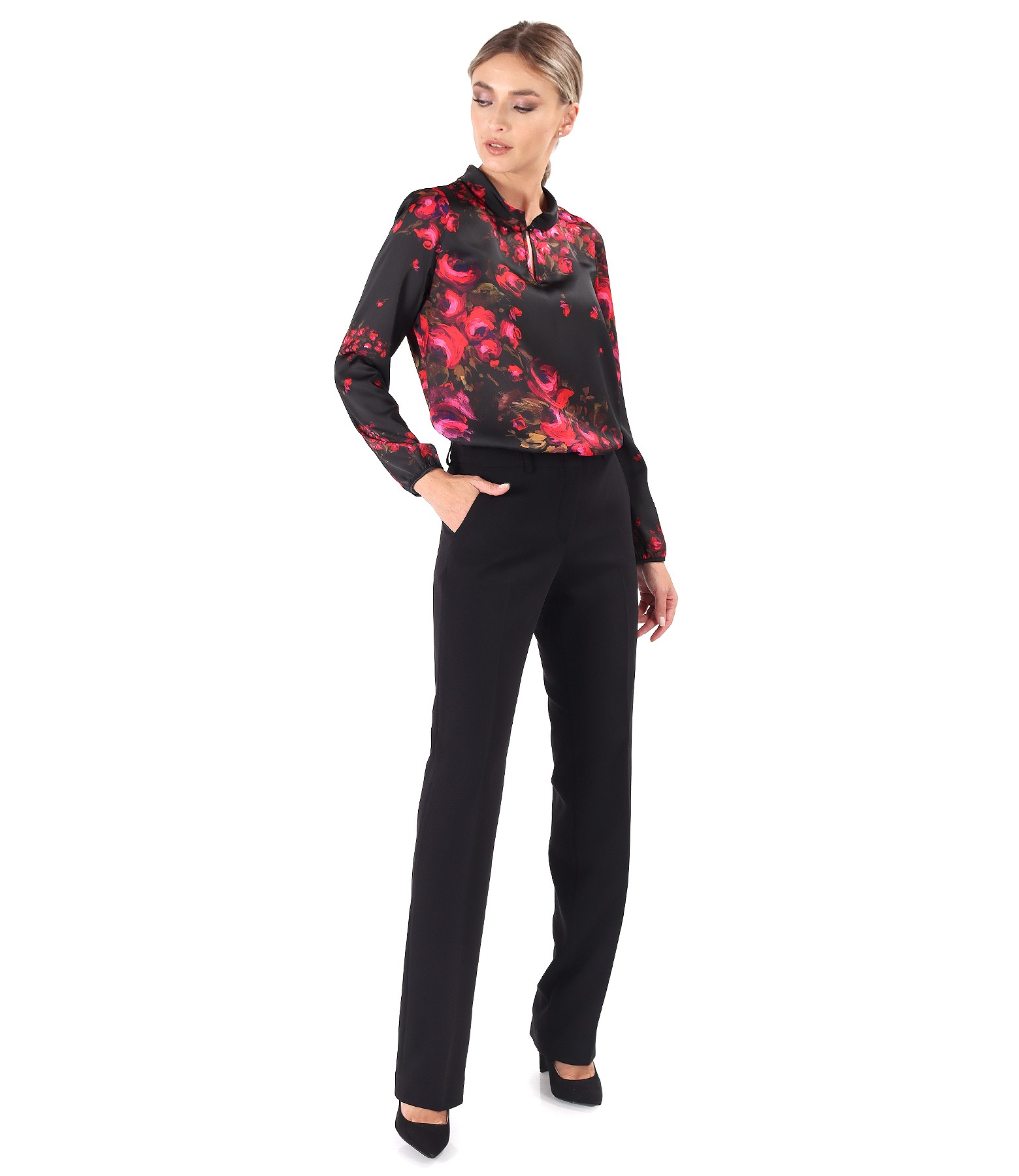 Bluza eleganta, din saten imprimat cu motive florale, maneci lungi cu elastic la terminatie, cu fald pe mijloc spate si decolteu rotund cu V inchis pe fata cu nasture.