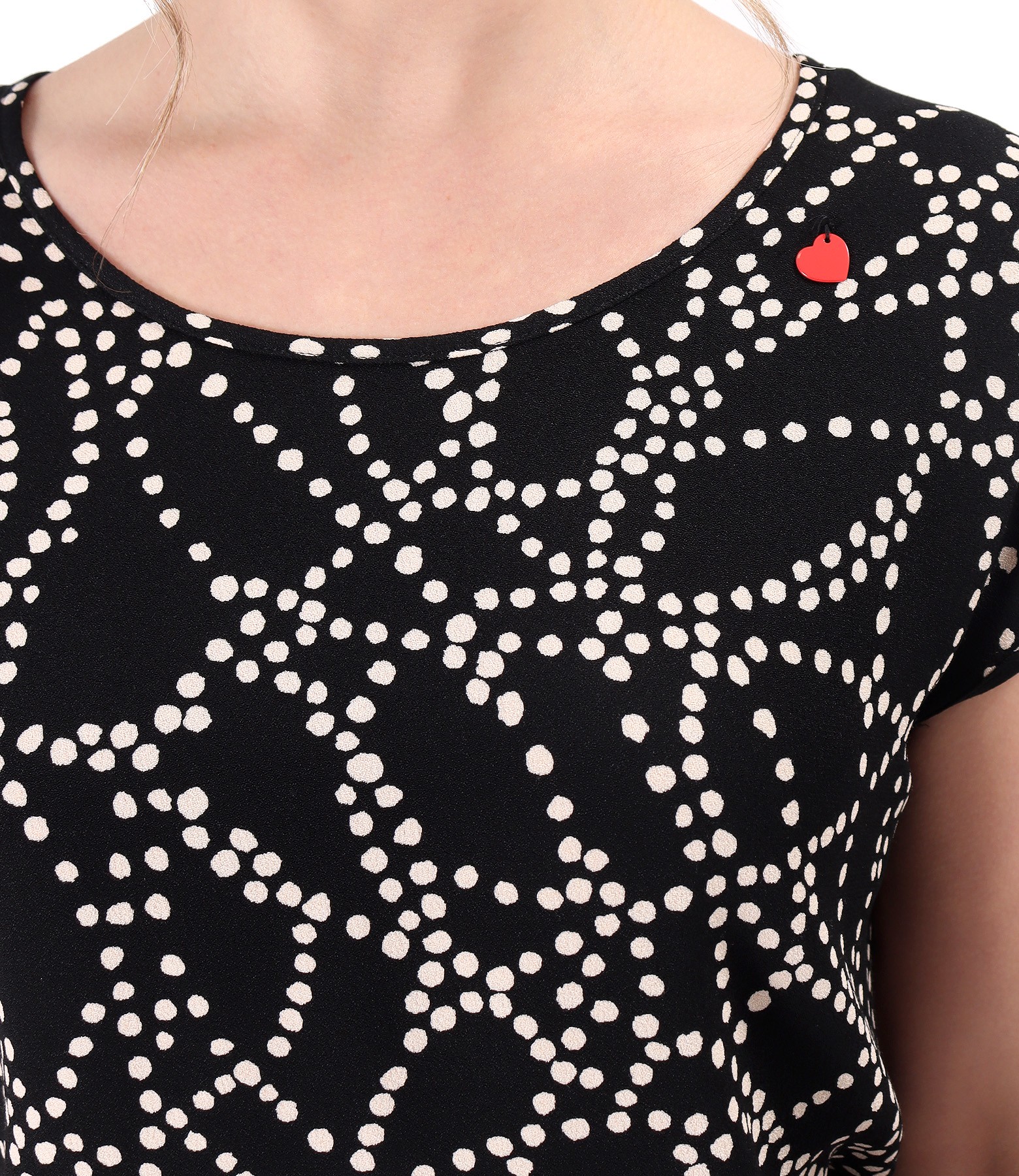 Bluza eleganta lejera din viscoza imprimata cu motive geometrice, cu umeri cazuti, elastic in talie si inima metalica decorativa la decolteu.