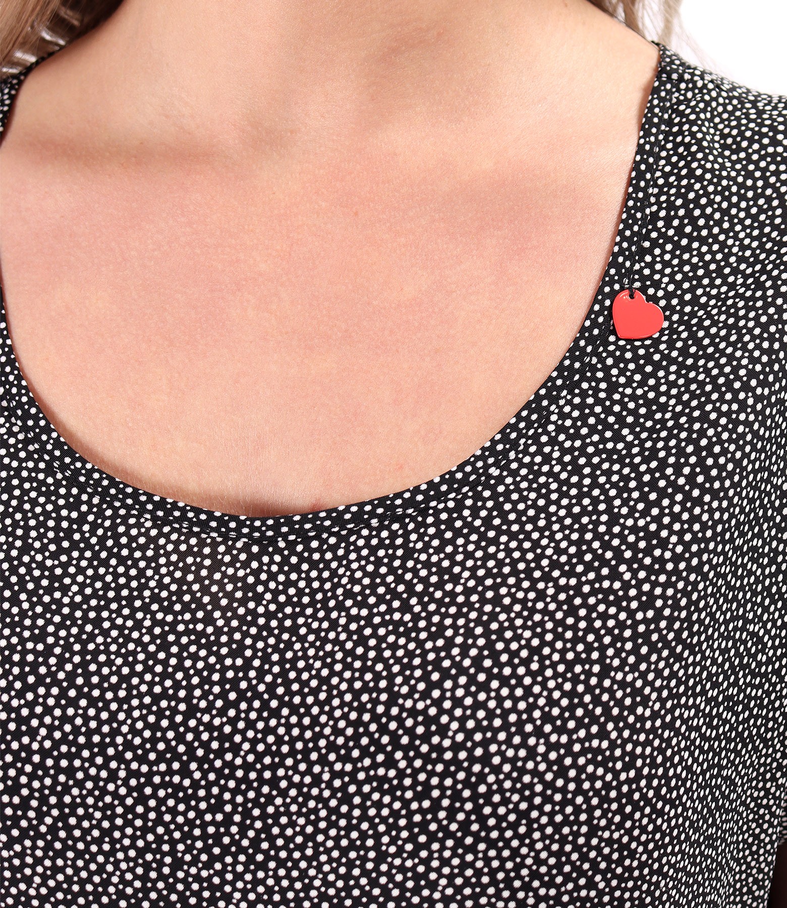 Bluza eleganta lejera din viscoza imprimata cu picouri, cu umeri cazuti, elastic in talie si inima metalica decorativa la decolteu.