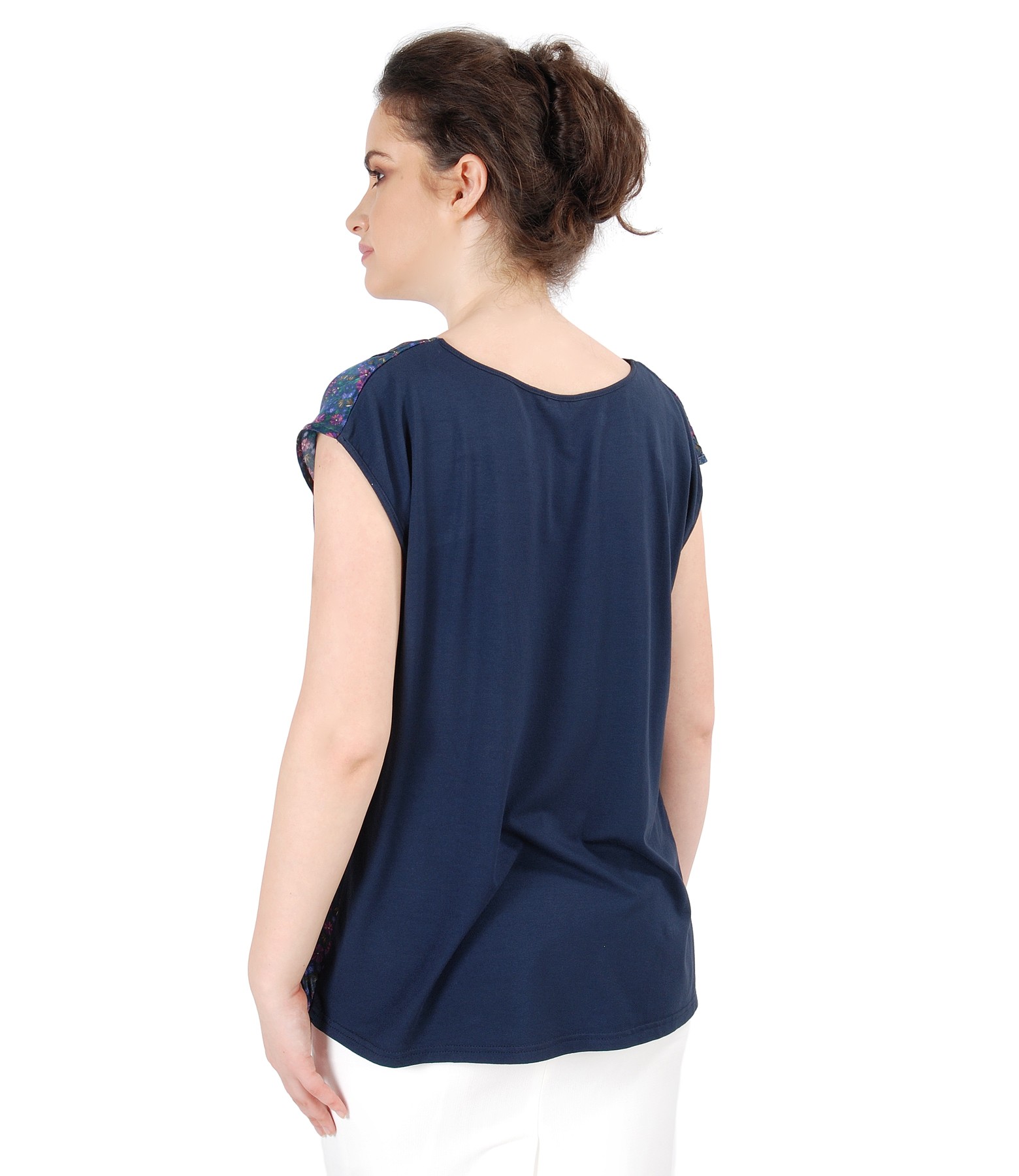 Bluza lejera, cu fata din matase imprimata digital cu motive florale, spate din jerse elastic uni, umeri cazuti si decolteu in V.