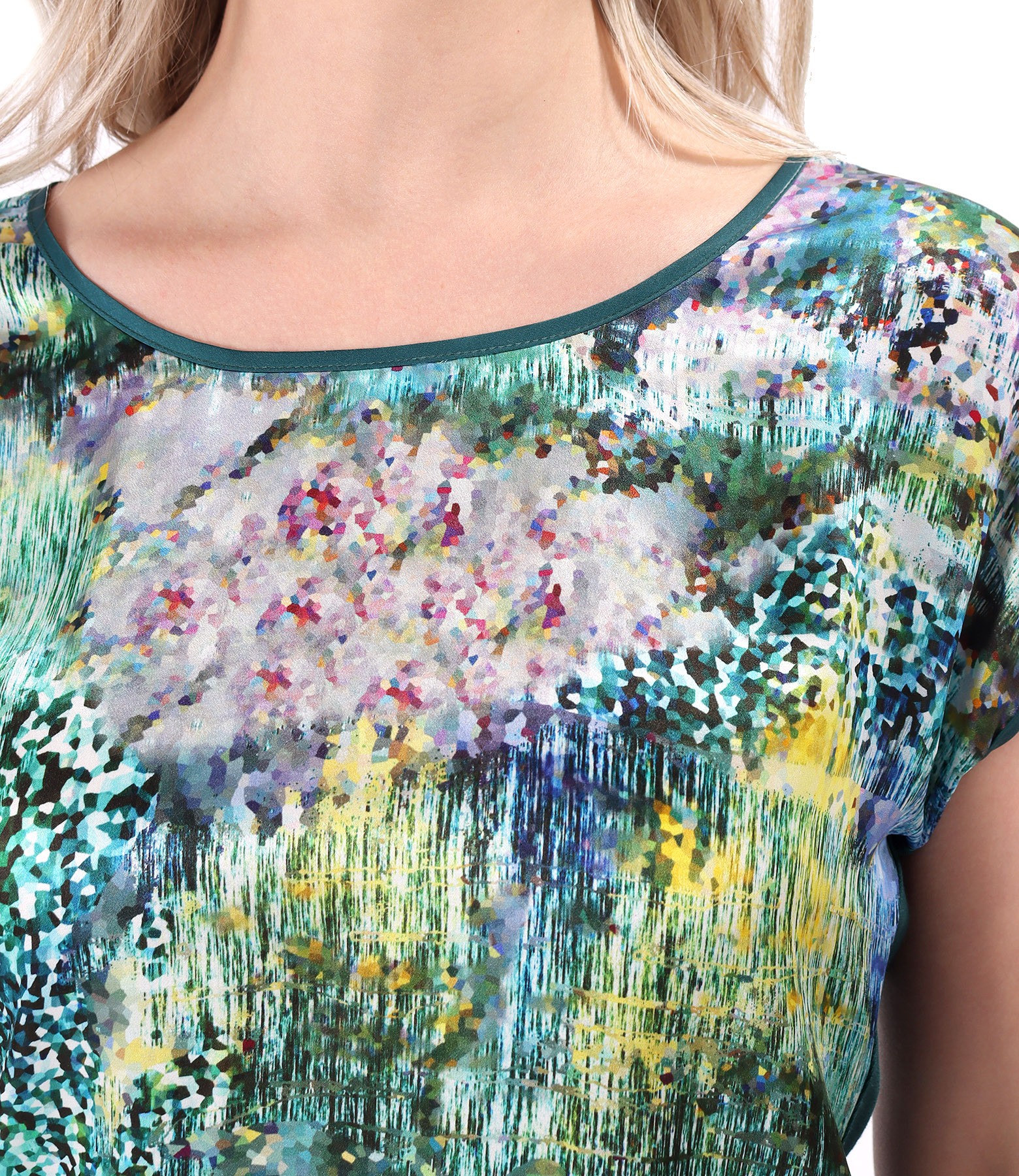 Bluza lejera cu fata din matase naturala imprimata, cu decolteu rotund, maneci cazute si spate din jerse elastic uni.