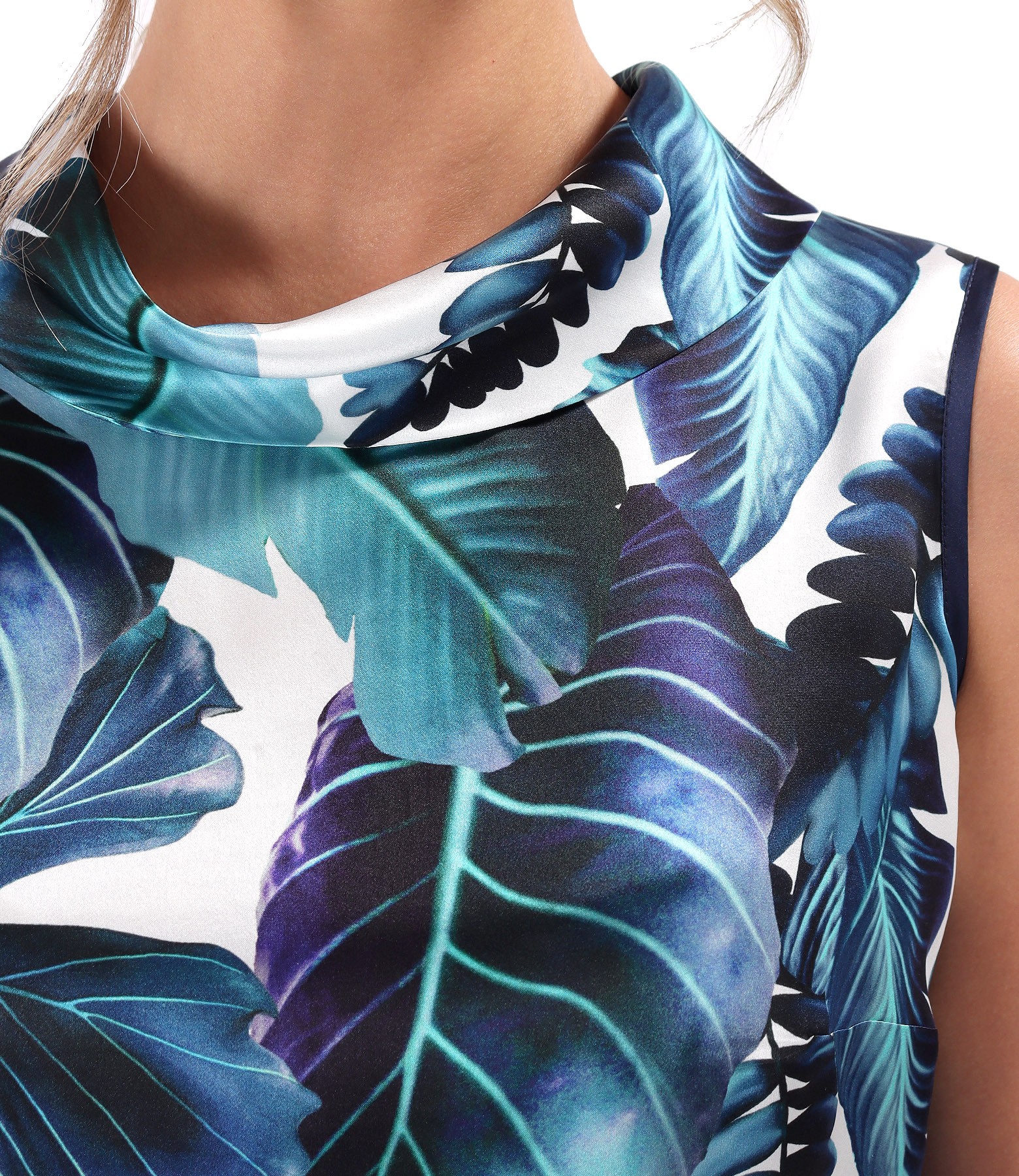 Bluza lejera cu fata din matase naturala imprimata digital cu motive florale, fara maneci, cu guler rotund la baza gatului si spate din jerse elastic uni. Se inchide cu 3 nasturi pe mijloc spate.