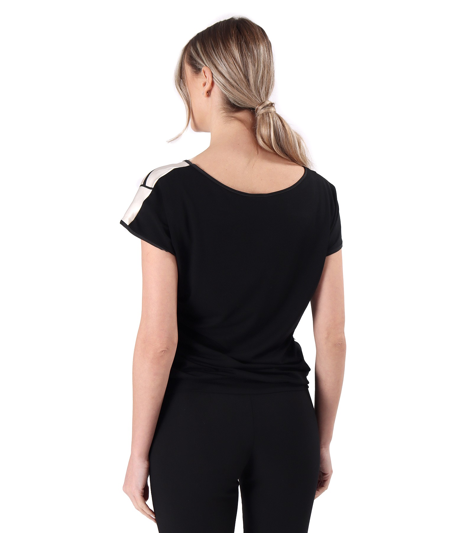 Bluza lejera cu fata din satin de viscoza imprimata cu motive geometrice, cu decolteu rotund, maneci cazute si spate din jerse elastic uni.