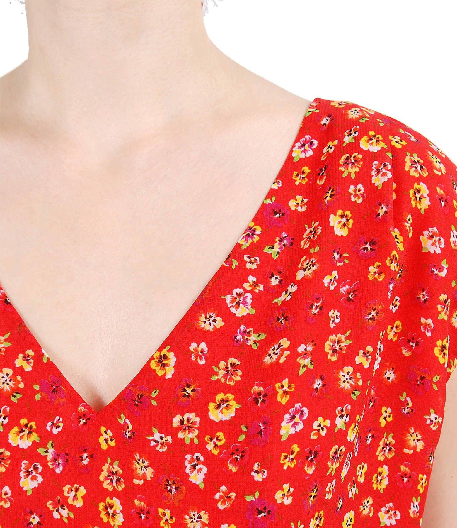 Bluza lejera, cu fata din imprimata cu motive florale, spate din jerse elastic uni, umeri cazuti si decolteu in V.