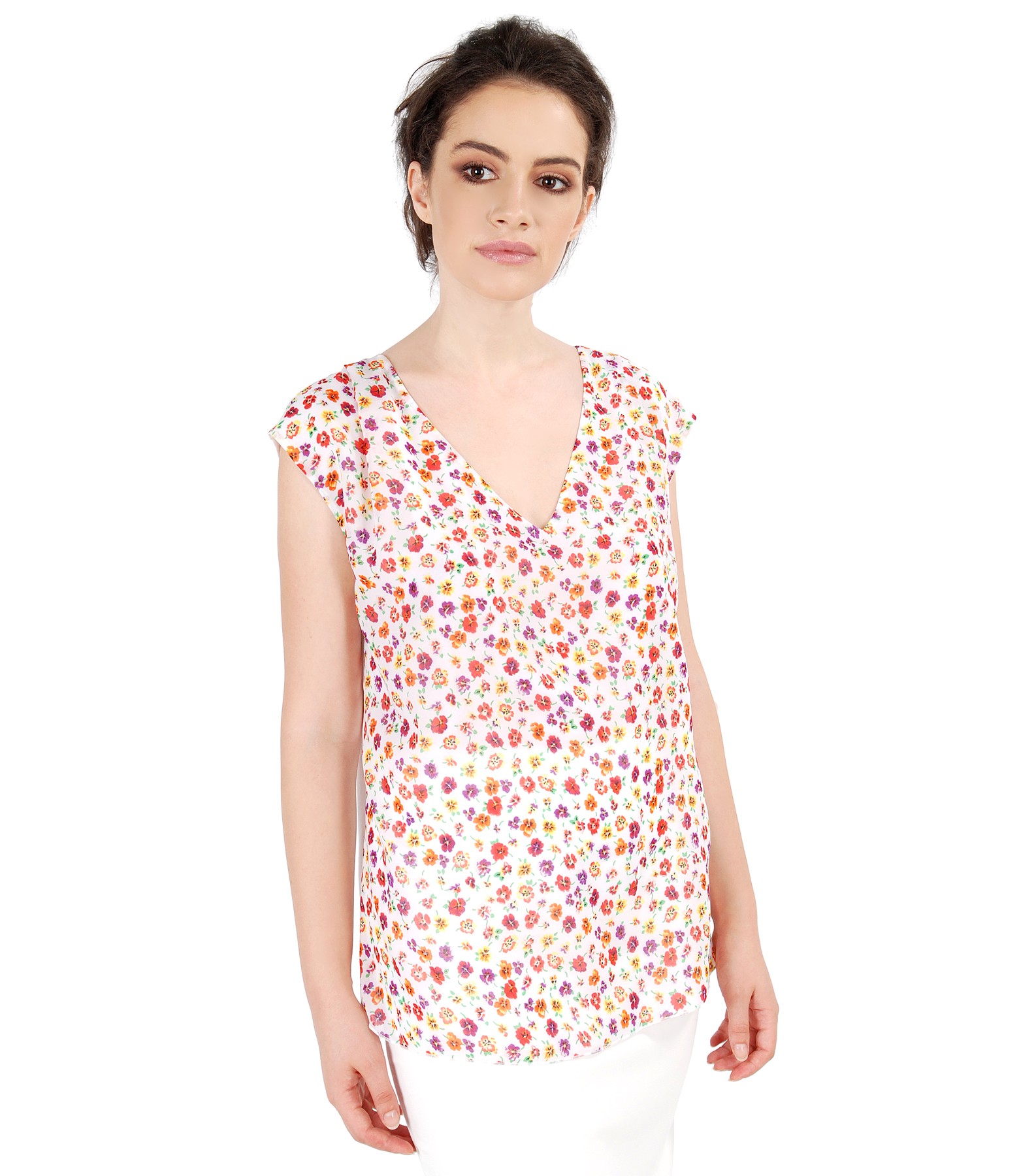 Bluza lejera, cu fata din imprimata cu motive florale, spate din jerse elastic uni, umeri cazuti si decolteu in V.
