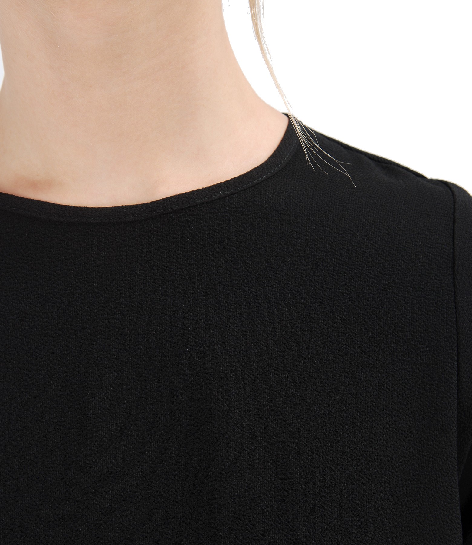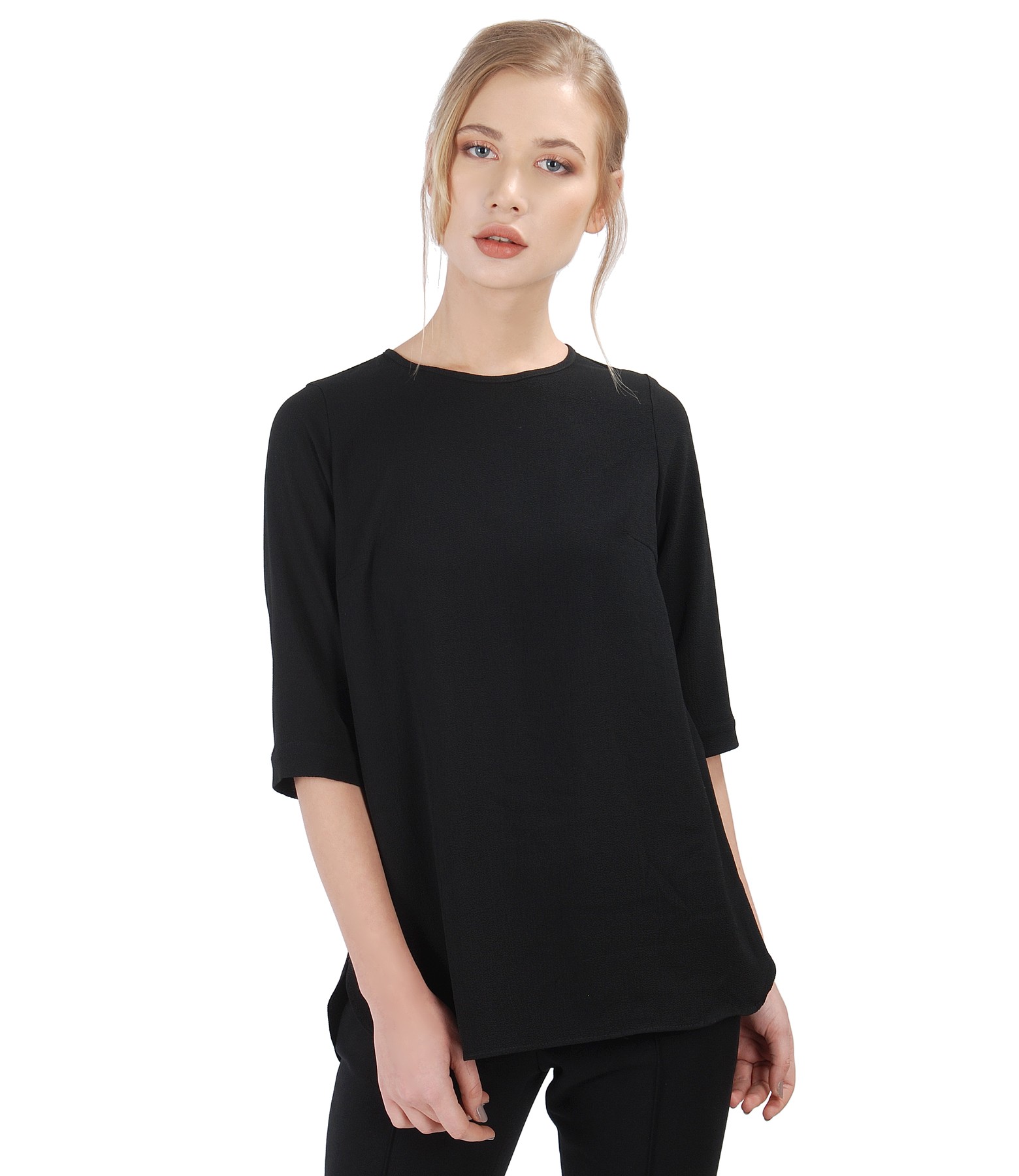 Bluza lejera cu maneci 3/4 cu mansete, fata si spate asimetrice, slituri pe laterale si fermoar metalic aplicat pe mijloc spate. Nu are sistem de inchidere.
