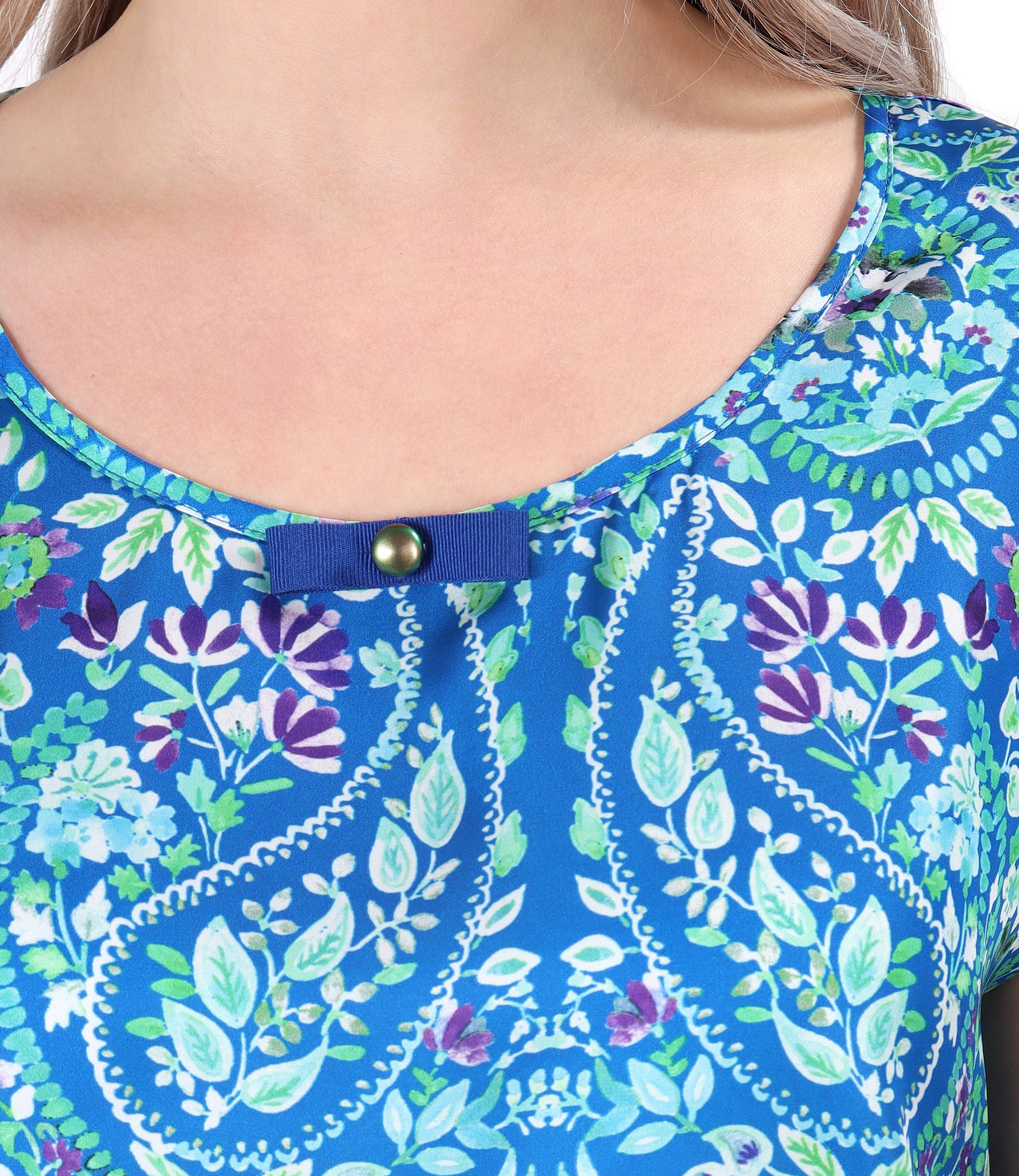 Bluza lejera, din saten imprimat cu motive florale, cu umeri cazuti, elastic in talie si funda din rips si aplicatie de cristale la decolteu. Pozitia imprimeului variaza per produs.