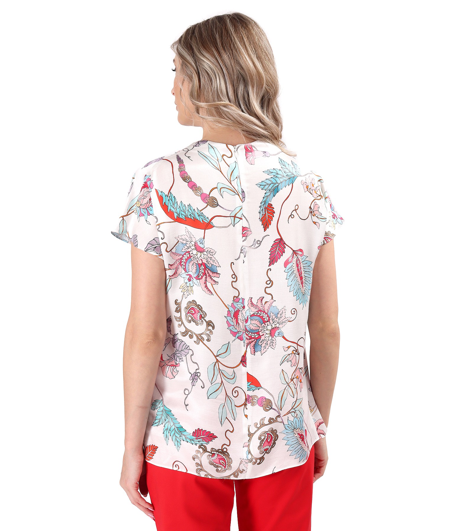 Bluza lejera cu pliuri pe umar stanga din viscoza cu matase imprimata digital cu motive florale si cu maneci scurte cazute. Se inchide cu fermoar pe mijloc spate.