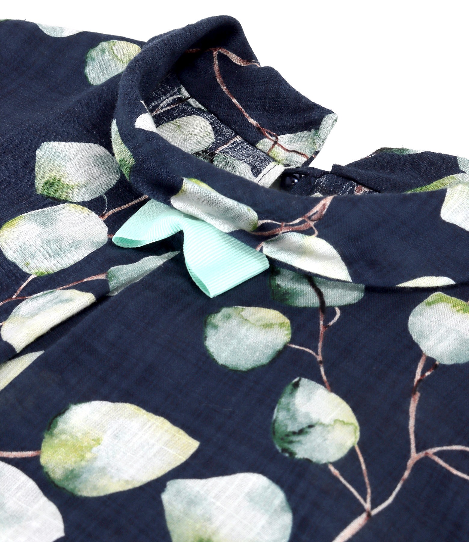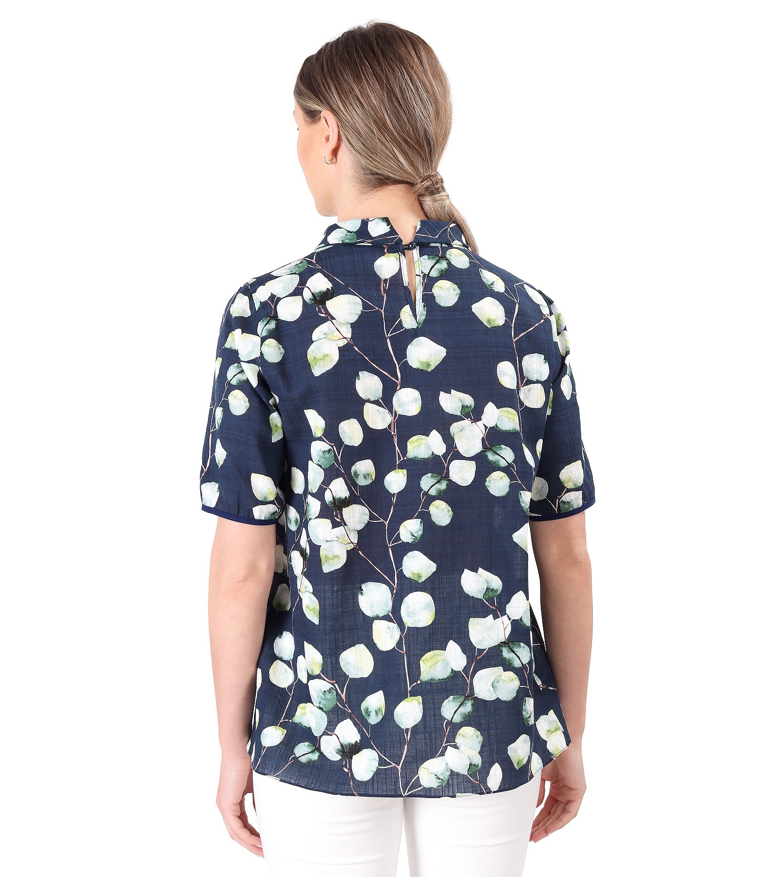 Bluza lejera din bumbac cu viscoza imprimata cu motive florale, maneci 3/4 incretite la terminatie, cu fald pe mijloc fata si funda din rips la decolteu. Se inchide cu un nasture pe mijloc spate.