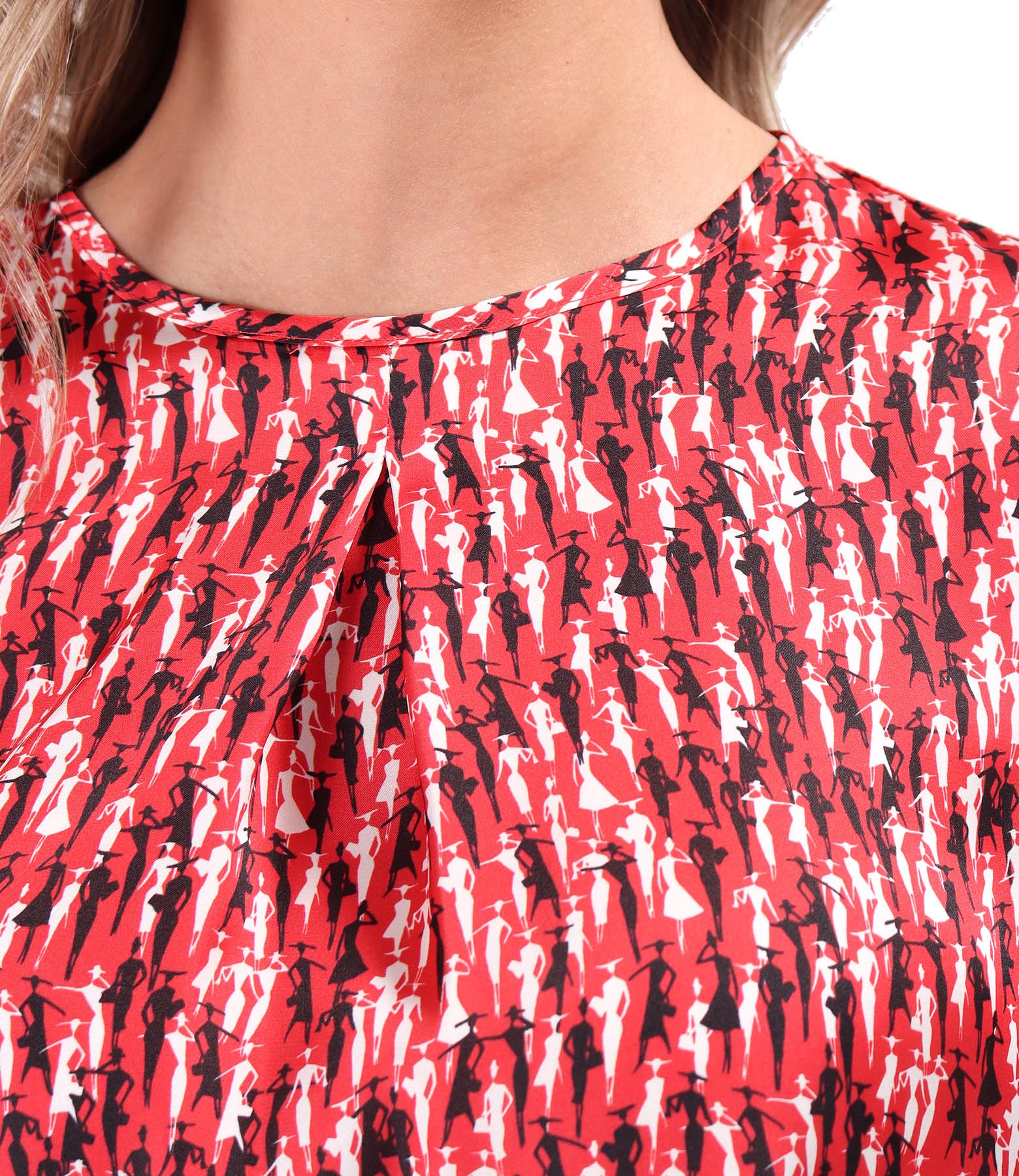 Bluza lejera din satin imprimat, cu maneci lungi incretite la terminatie si decolteu rotund cu fald pe mijloc fata. Se inchide cu un nasture pe mijloc spate.