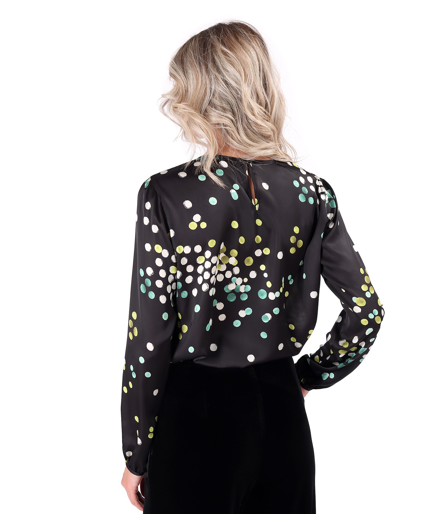 Bluza lejera din satin imprimat digital cu buline colorate, cu maneci lungi incretite la terminatie si decolteu rotund cu fald pe mijloc fata. Se inchide cu un nasture pe mijloc spate.