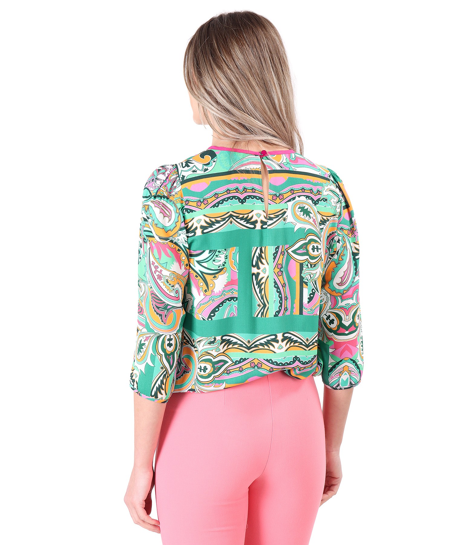 Bluza lejera din viscoza imprimata, cu maneci 3/4, cu decolteu rotund si falduri pe fata. Se inchide cu un nasture pe mijloc spate. Pozitia imprimeului variaza per produs.