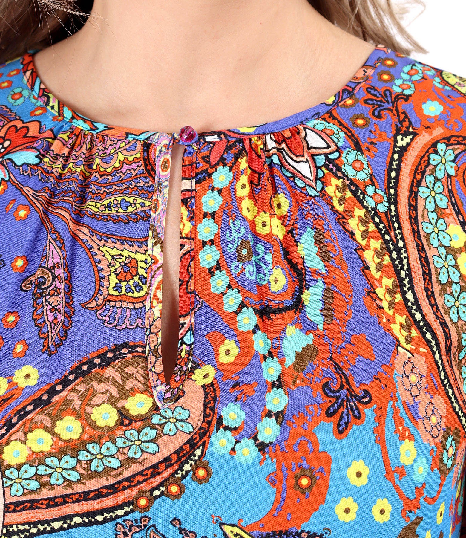 Bluza lejera din viscoza imprimata digital cu lire, cu maneci lungi cu elastic, cu decolteu rotund si terminatie elastica in talie. Se inchide cu un nasture pe mijloc fata. Pozitia imprimeului variaza per produs.