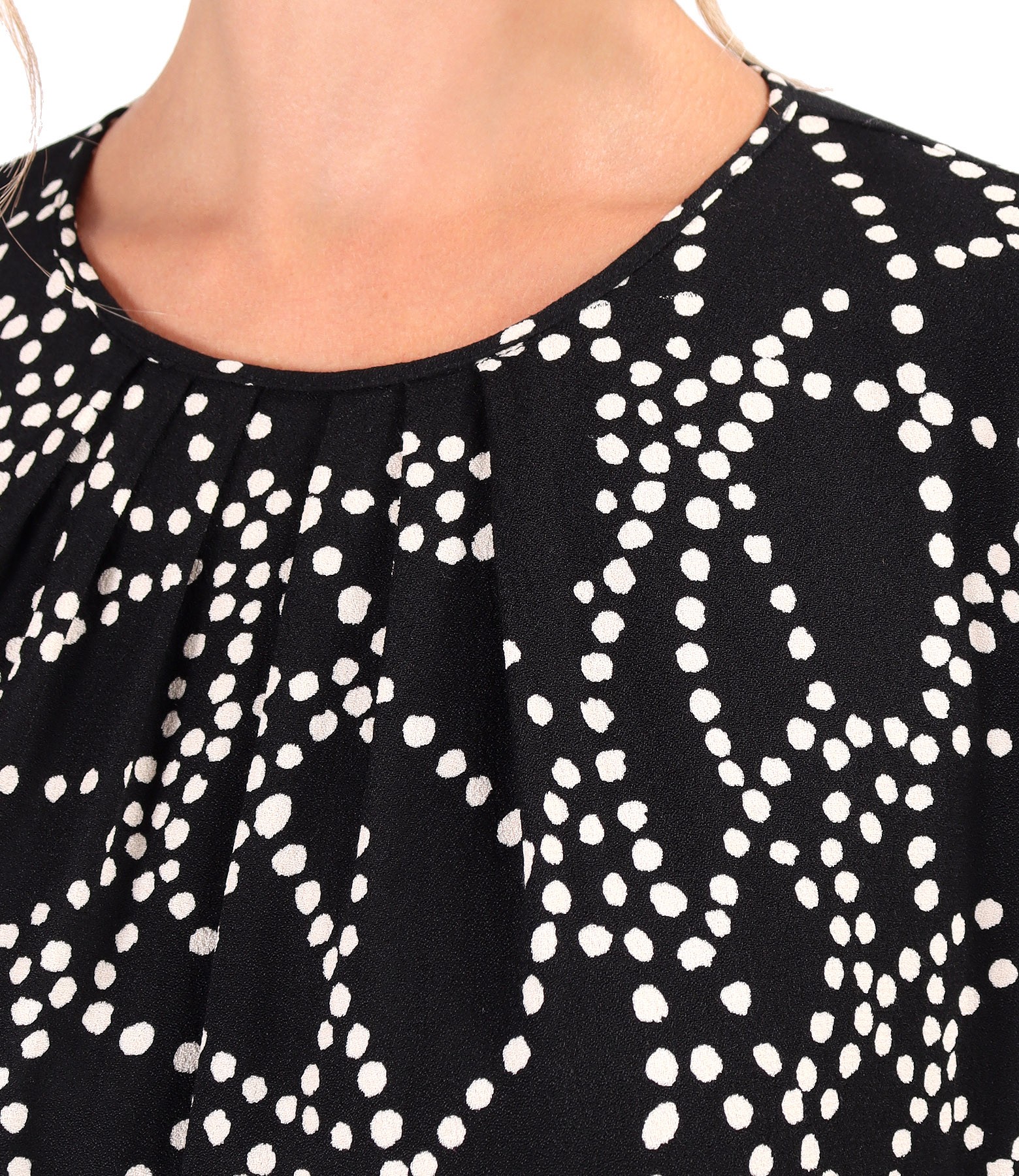 Bluza lejera din viscoza plina cu falduri la decolteu, imprimata cu motive geometrice, cu maneci lungi incretite la terminatie. Se inchide cu un nasture pe mijloc spate.
