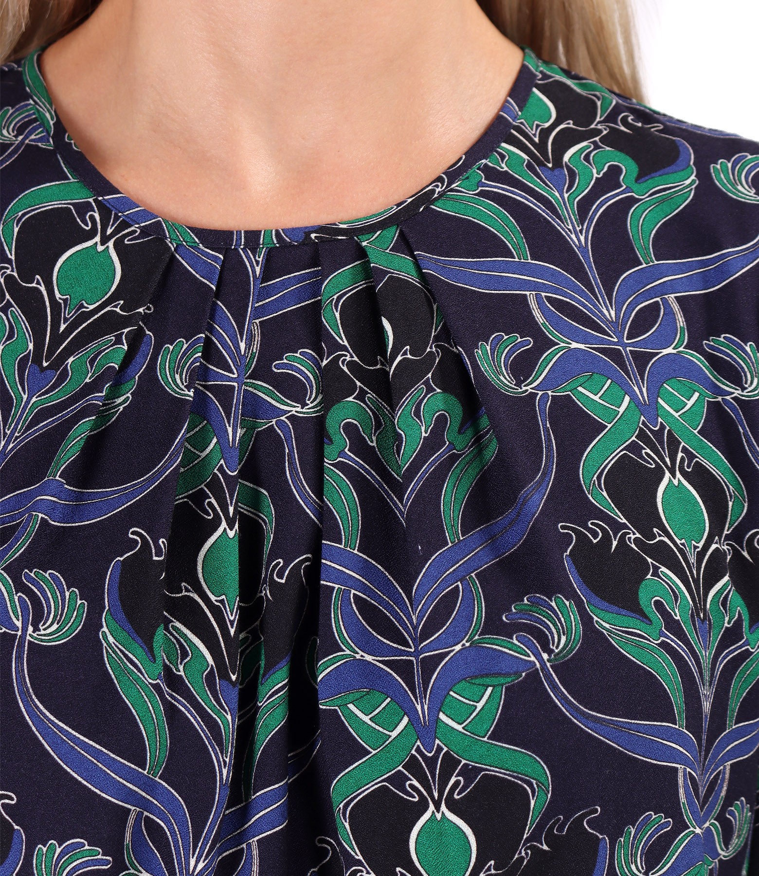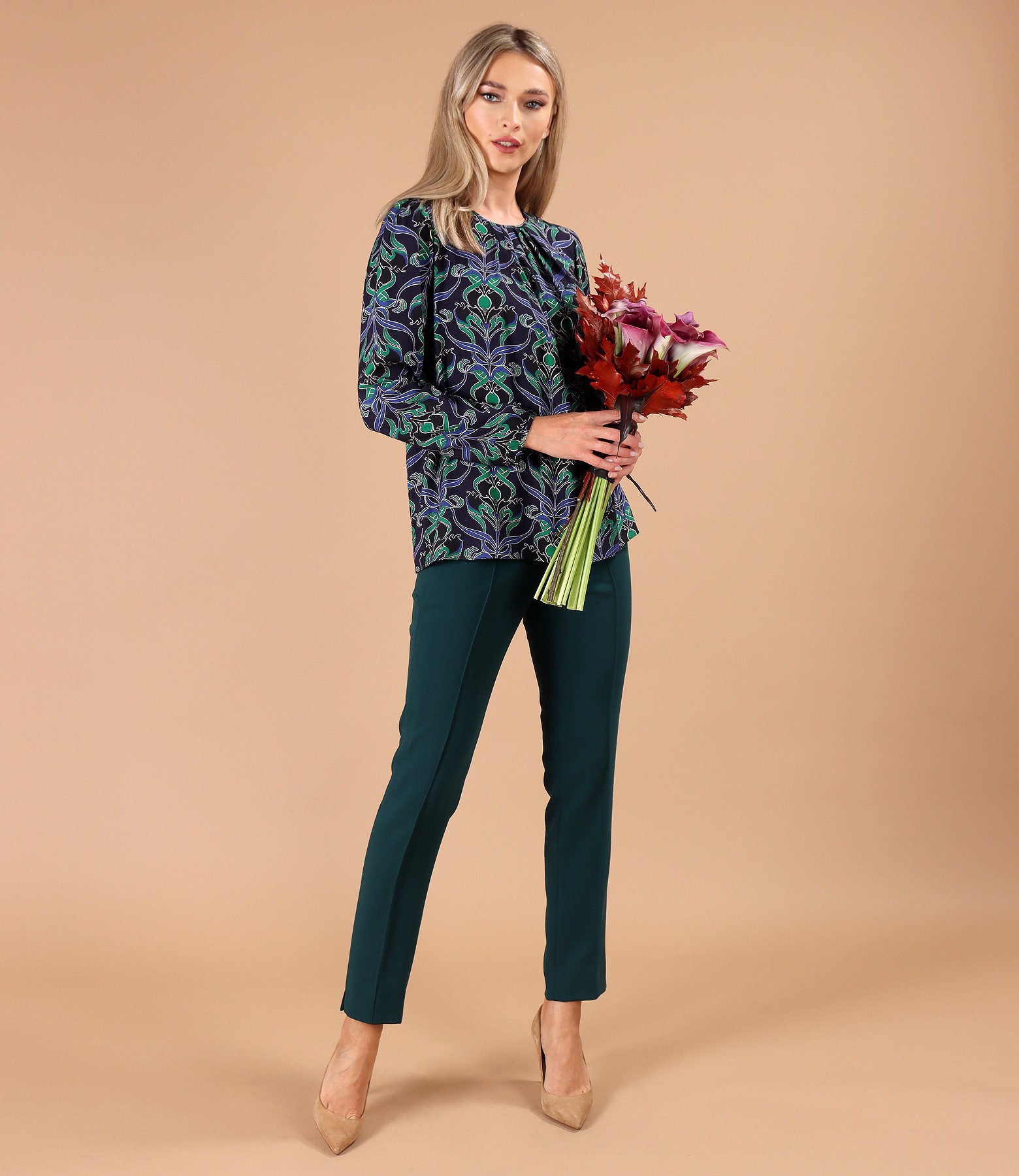 Bluza lejera din viscoza plina imprimata cu motive florale, cu falduri la decolteu si cu maneci lungi incretite la terminatie. Se inchide cu un nasture pe mijloc spate.
