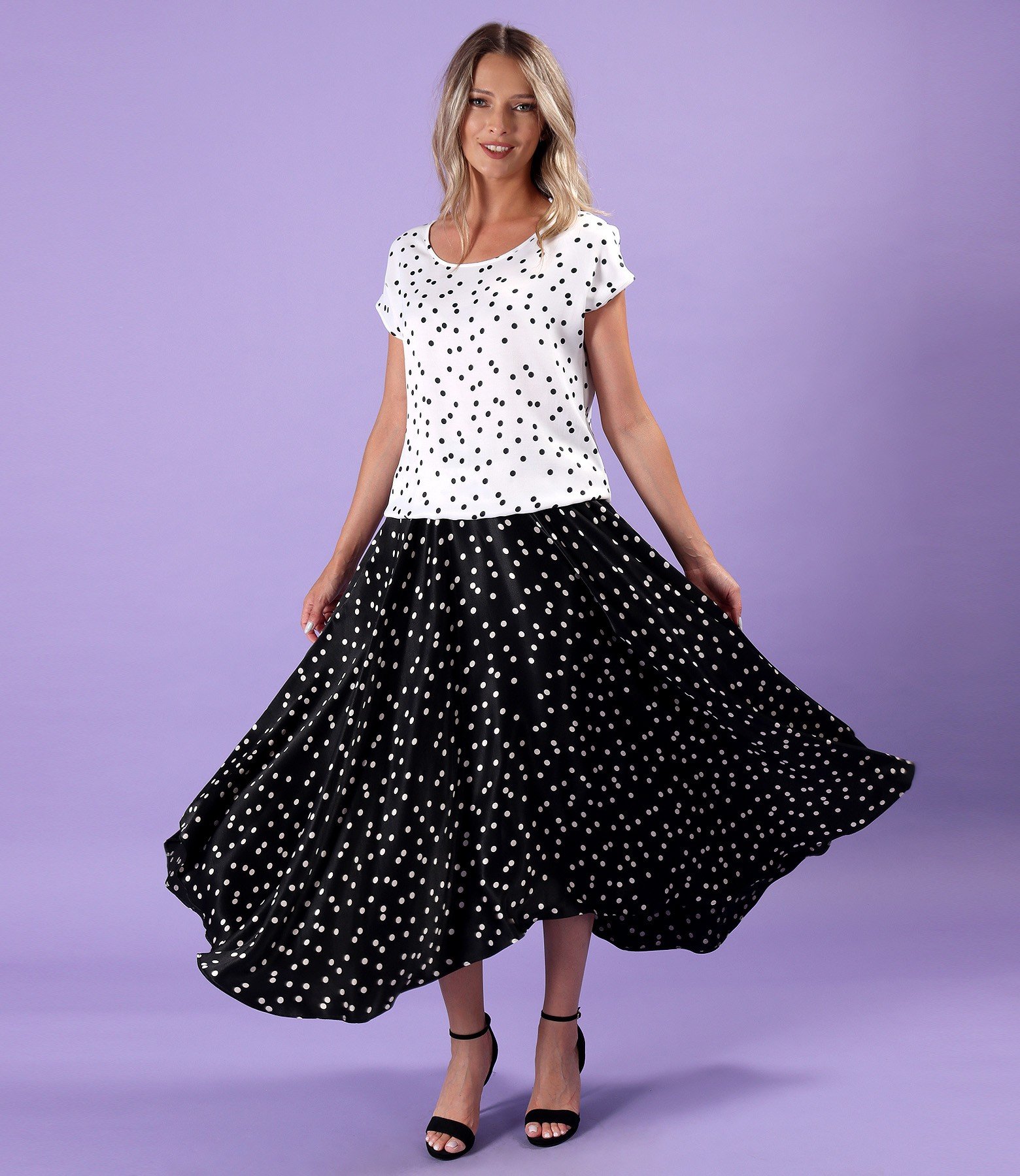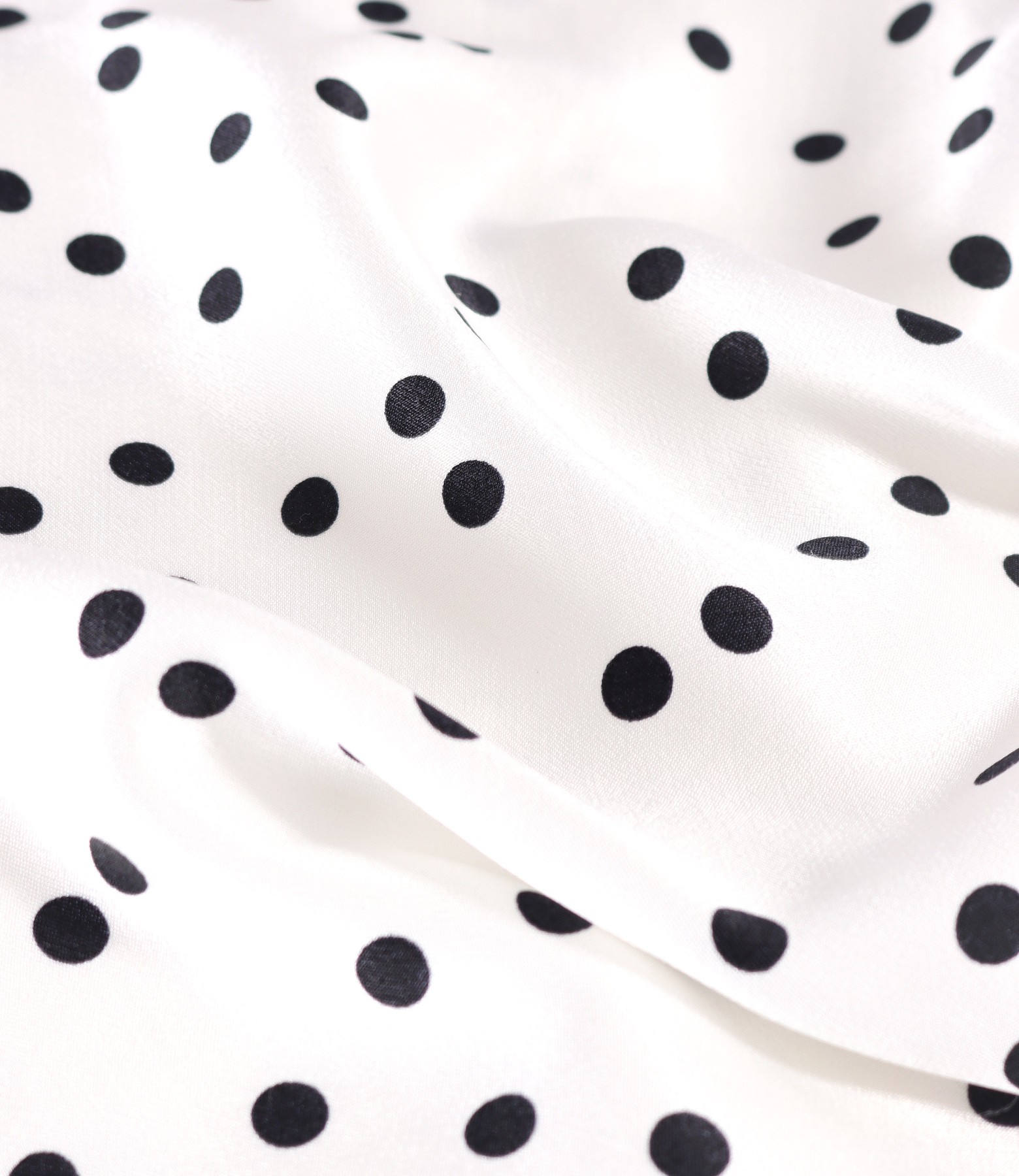 Bluza lejera din viscoza satinata imprimata cu buline, cu umeri cazuti si elastic in talie.