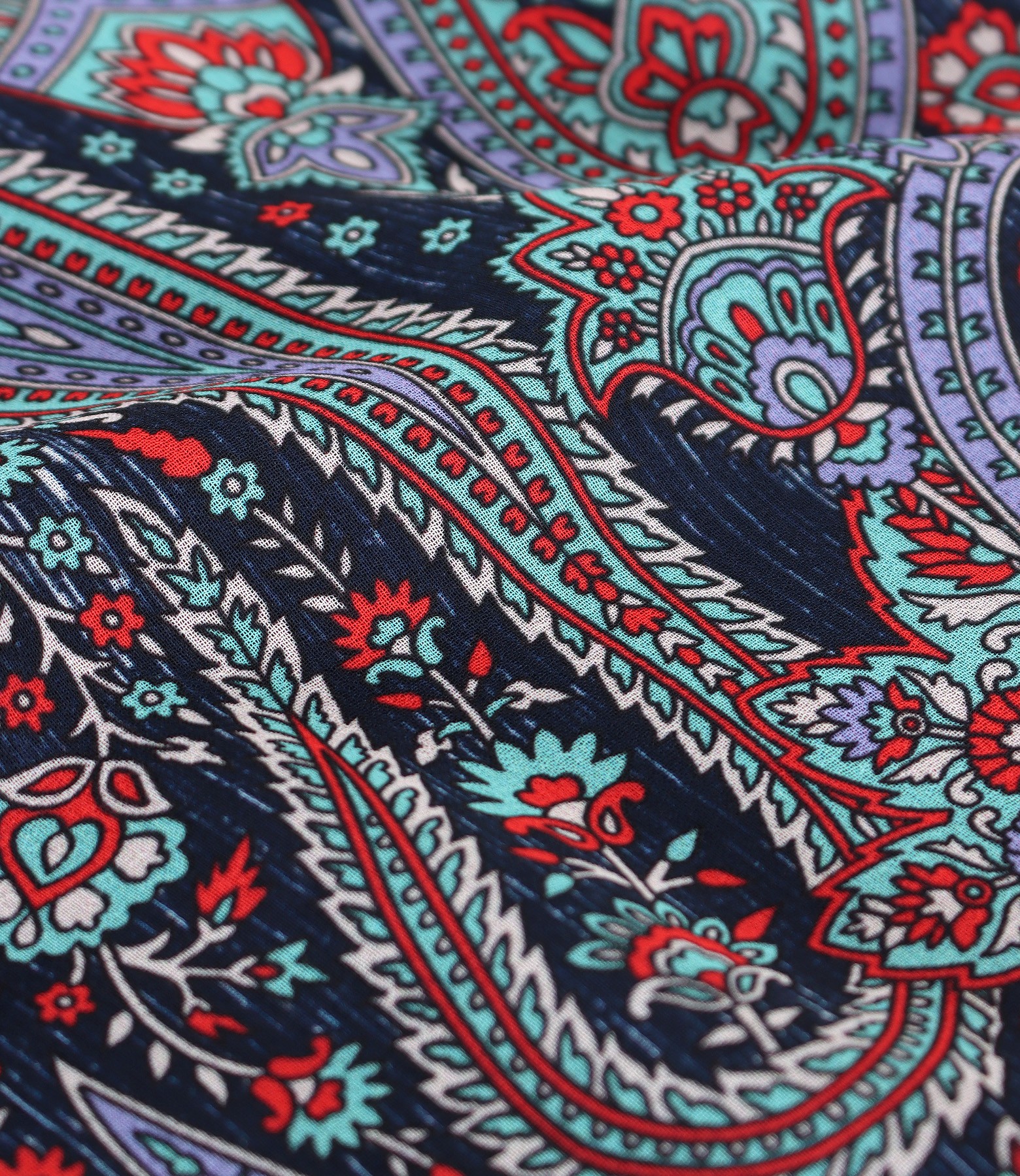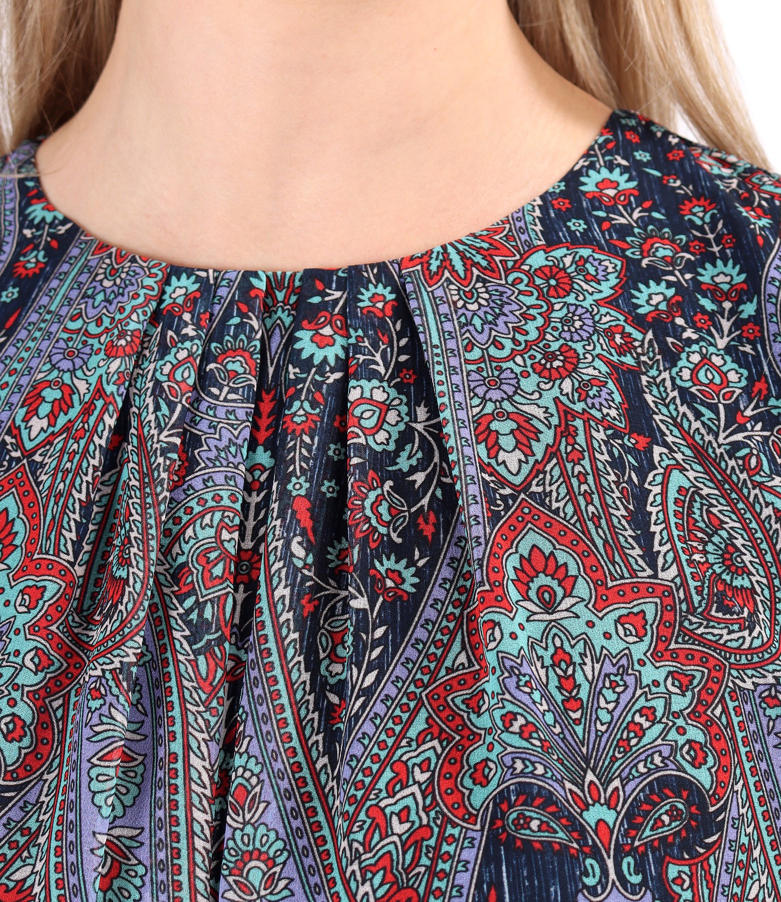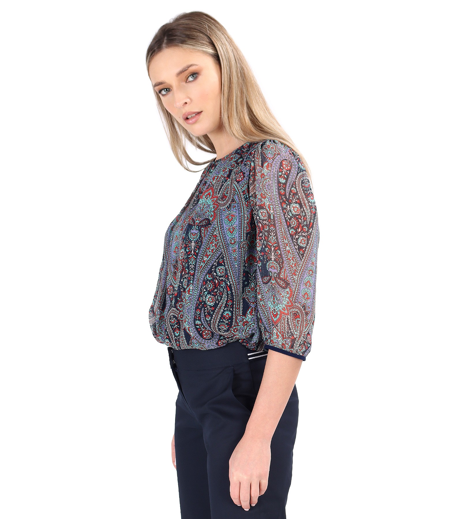 Bluza eleganta din voal imprimat cu lire, dublat cu viscoza, cu maneci 3/4 si decolteu rotund. Se inchide cu un nasture pe mijloc spate.