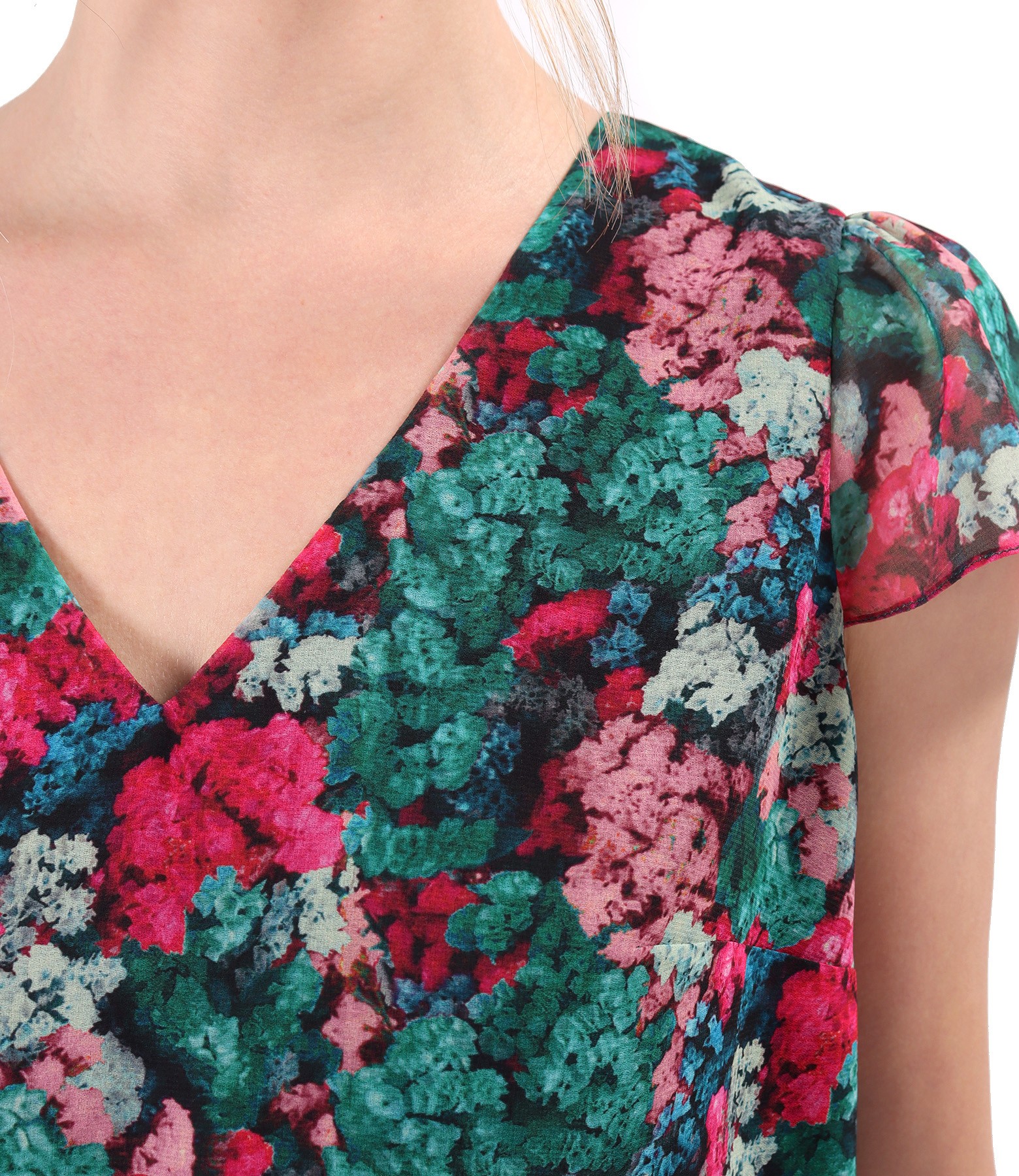 Bluza lejera din voal imprimat cu motive florale, dublata cu viscoza, cu maneci aripioare si decolteu in V.