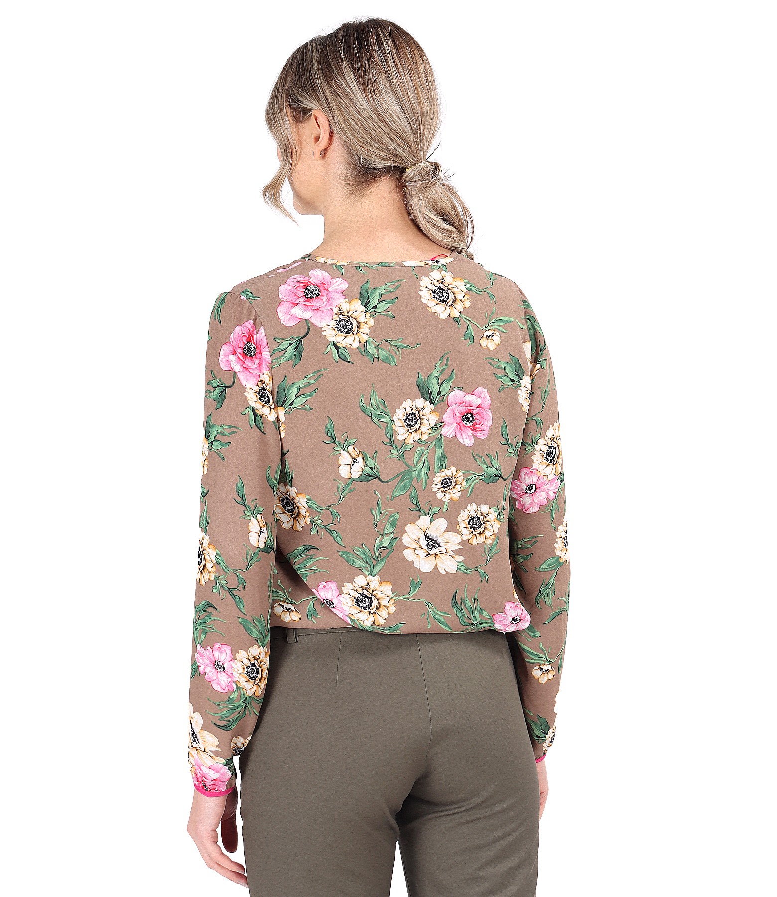 Bluza lejera imprimata cu motive florale, cu decolteu in V si maneci lungi incretite la terminatie.