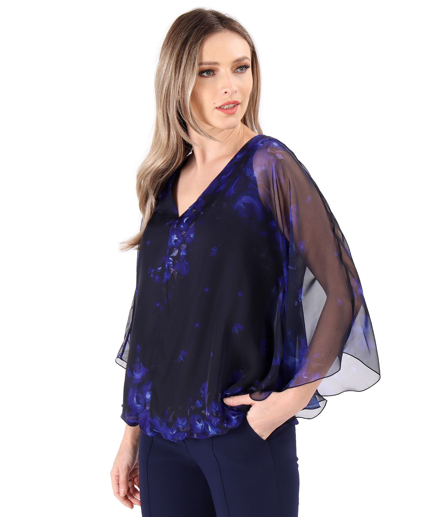 Bluza tip fluture din voal imprimat digital cu motive florale, cu decolteu in V, dublata cu jerse elastic de viscoza si cu terminatie bluzata.