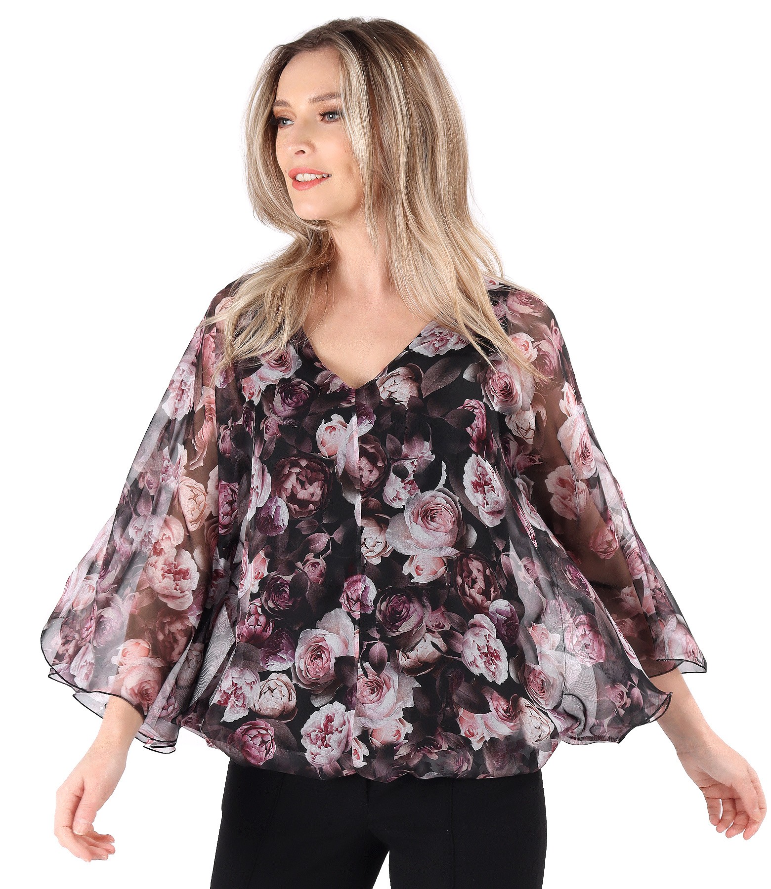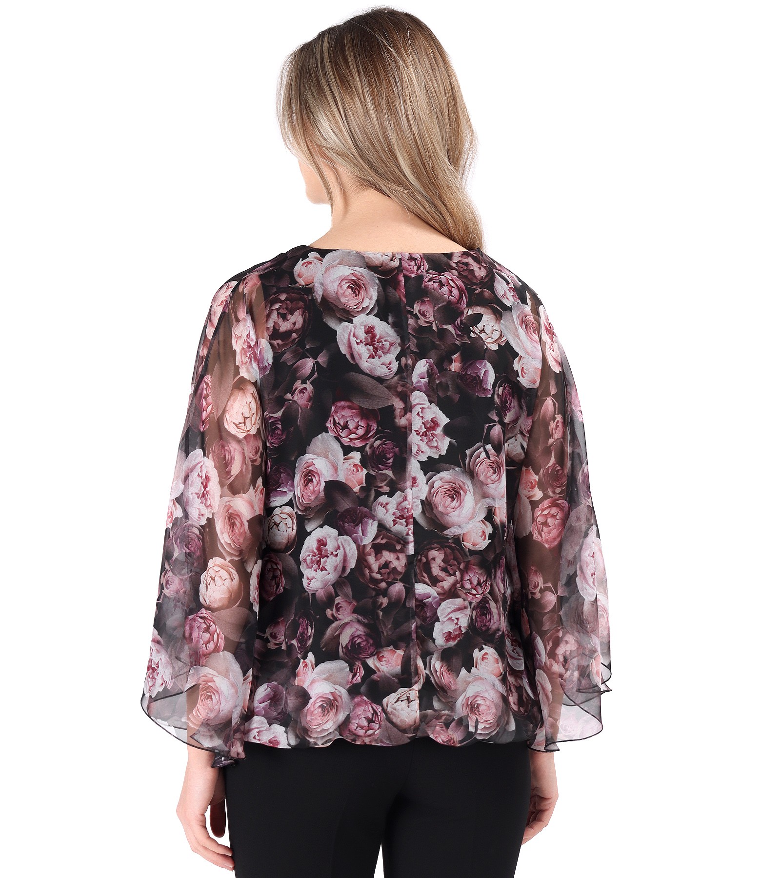 Bluza tip fluture din voal imprimat digital cu motive florale, cu decolteu in V, dublata cu jerse elastic de viscoza si cu terminatie bluzata.