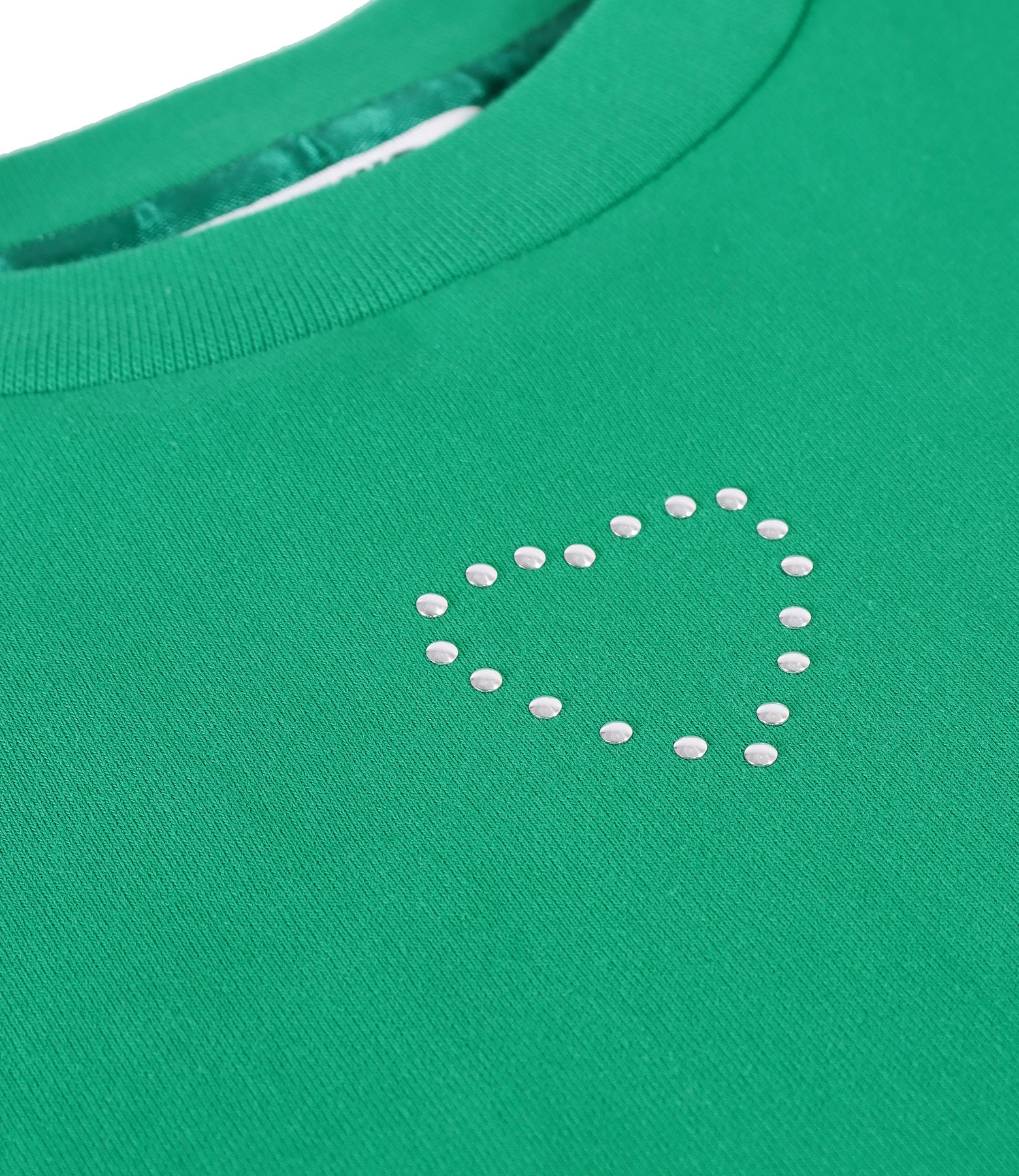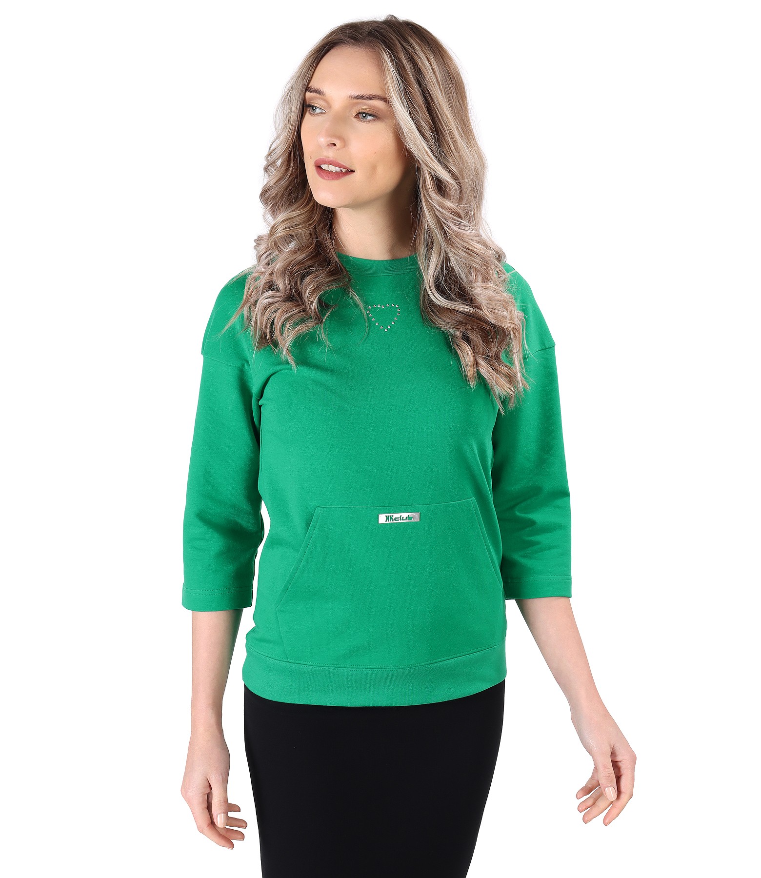 Bluza tip hanorac din bumbac elastic uni, cu buzunar pe fata, maneci 3/4, decolteu rotund si elemente decorative pe fata.