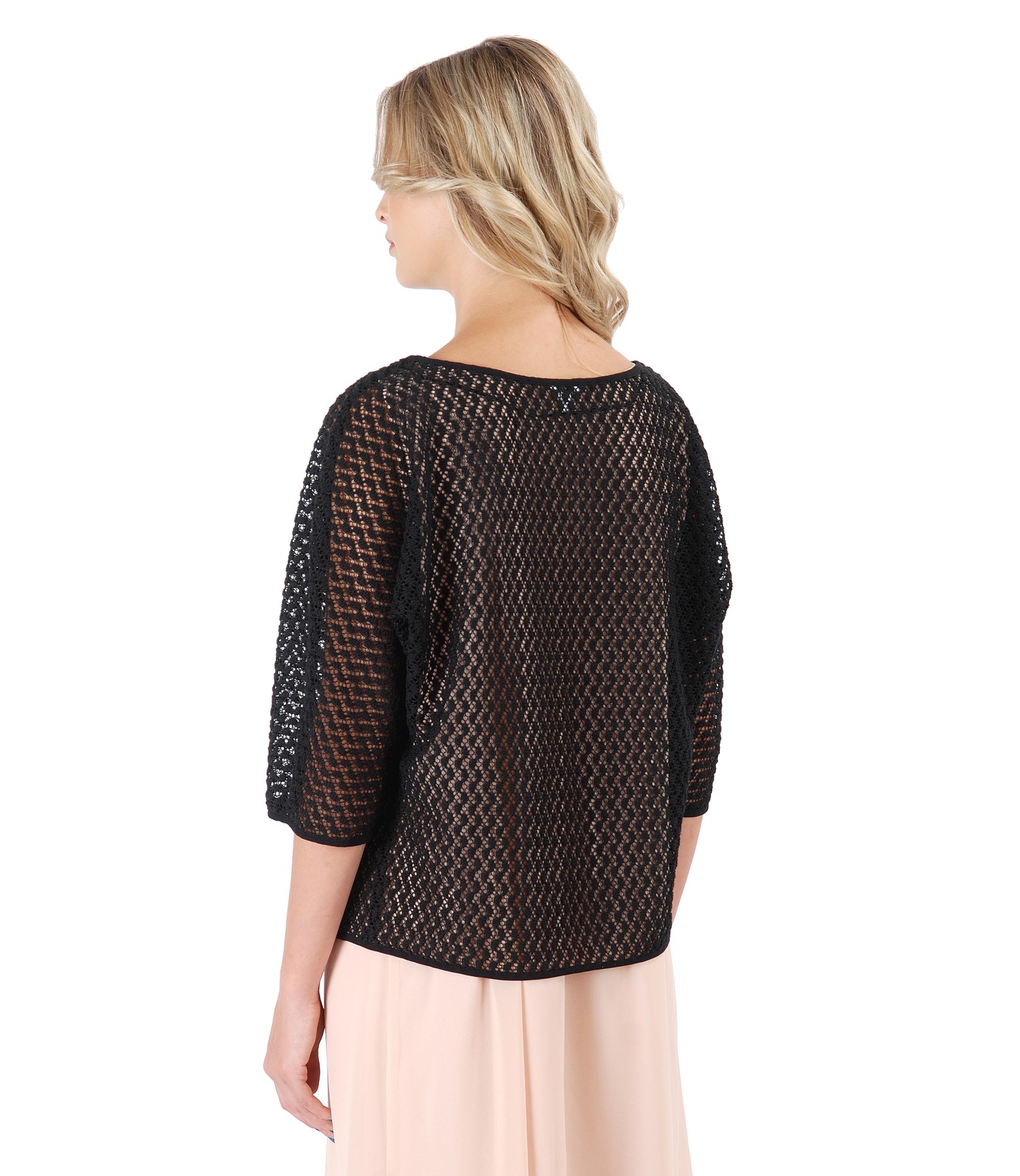 Bolero din dantela cu bumbac, cu maneci kimono 3/4. Se inchide pe fata cu un brandemburg in partea superioara.