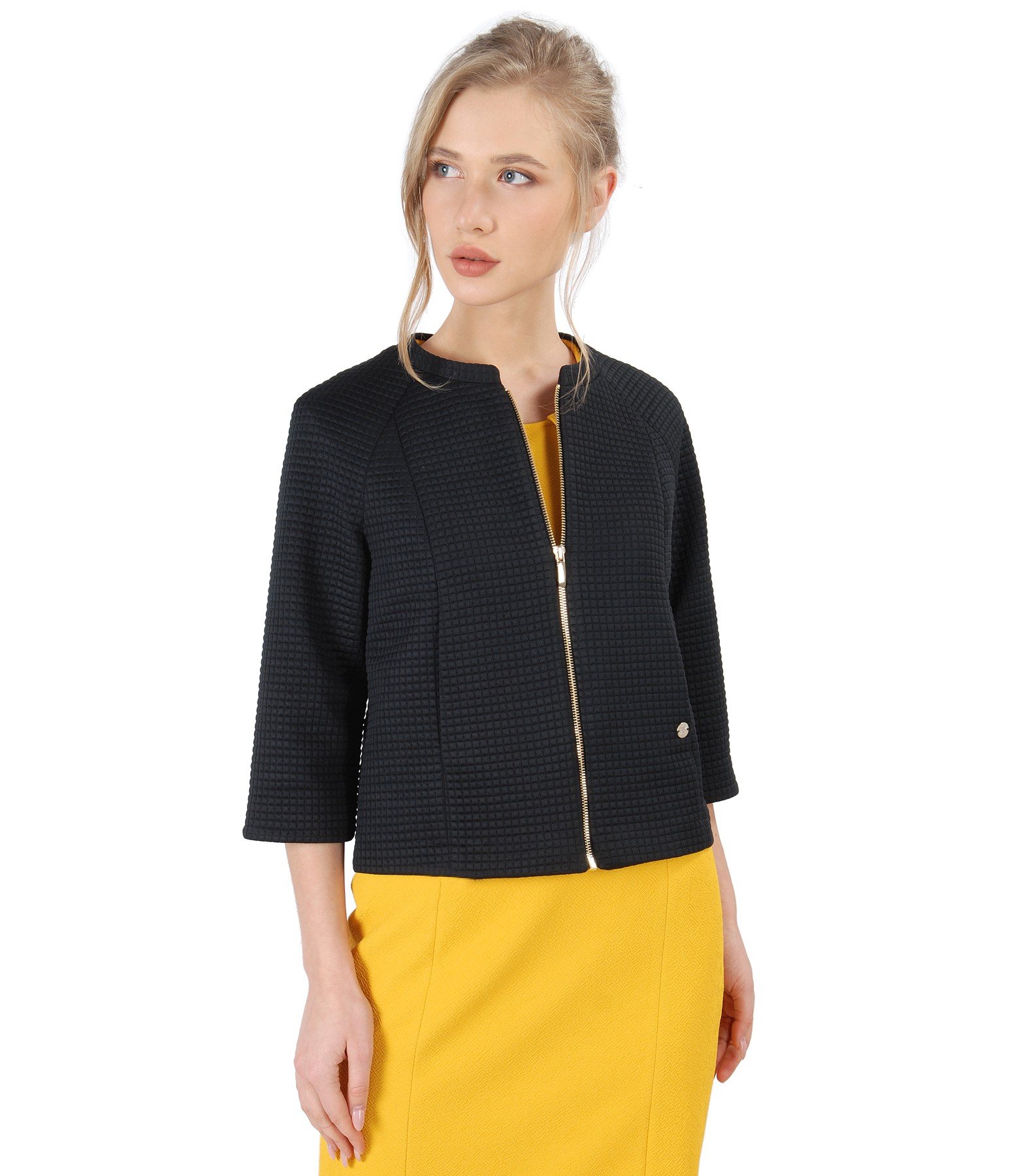 Bolero din brocart elastic cu motive geometrice, captusit, cu guler gen tunica, maneci 3/4 si buzunare ascunse verticale. Se inchide cu un fermoar metalic pe fata.