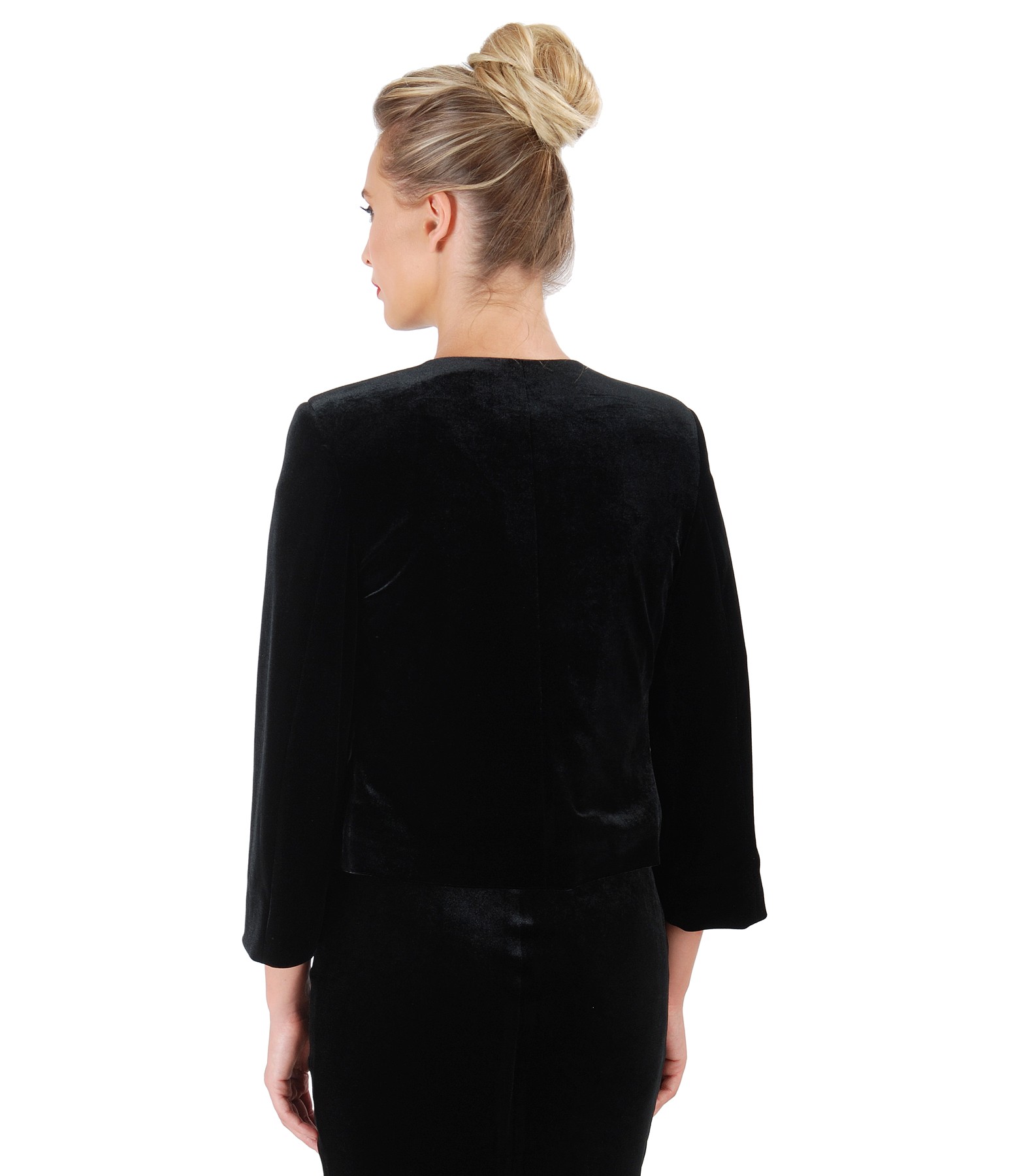 Bolero din catifea elastica, captusit, cu maneci 3/4 si aplicatie de cristale pe decolteu. Se inchide cu 2 capse mos-baba in partea superioara.
