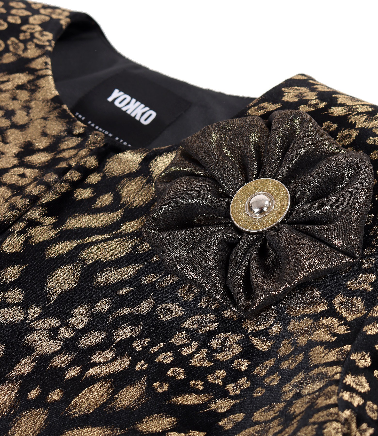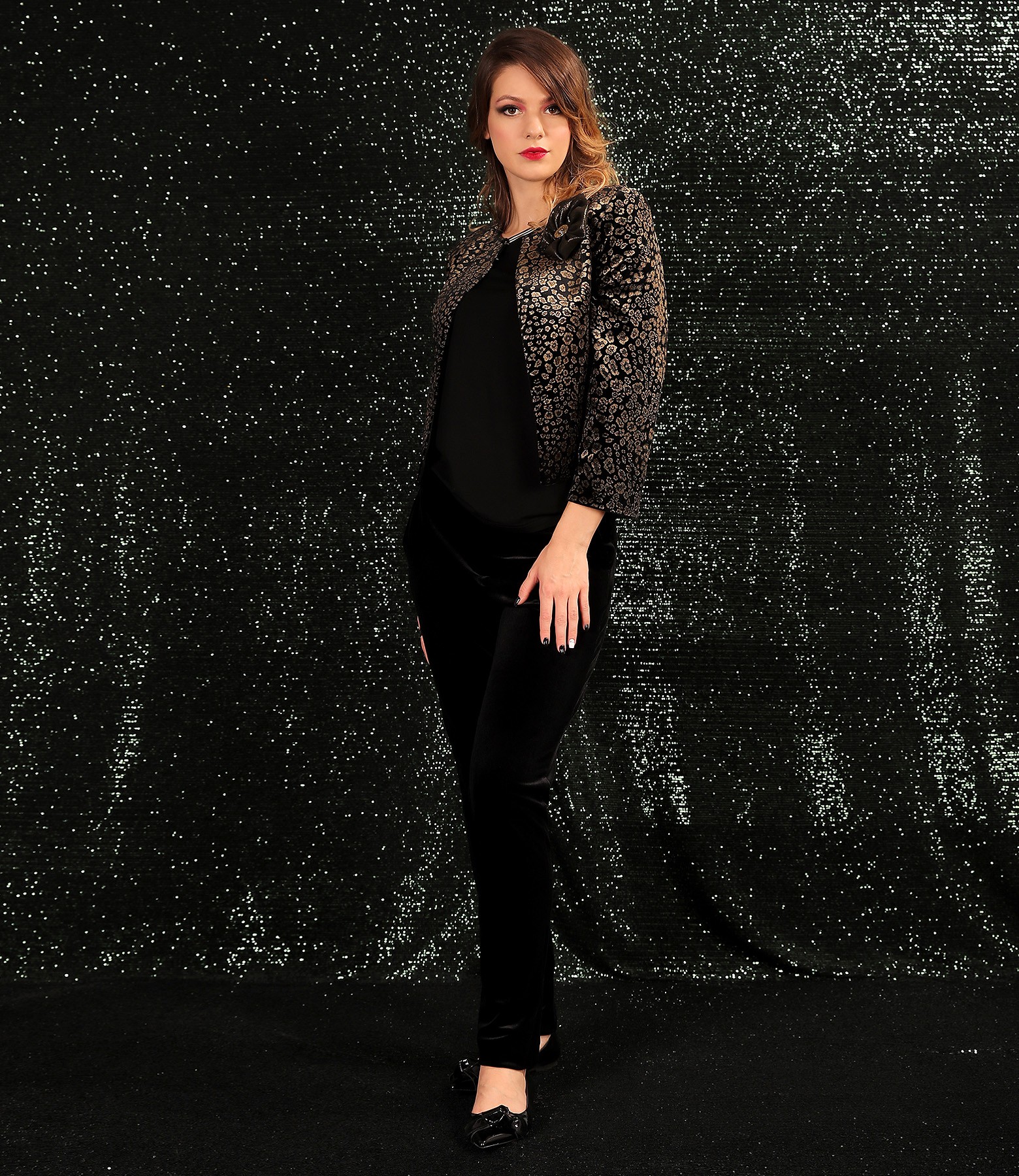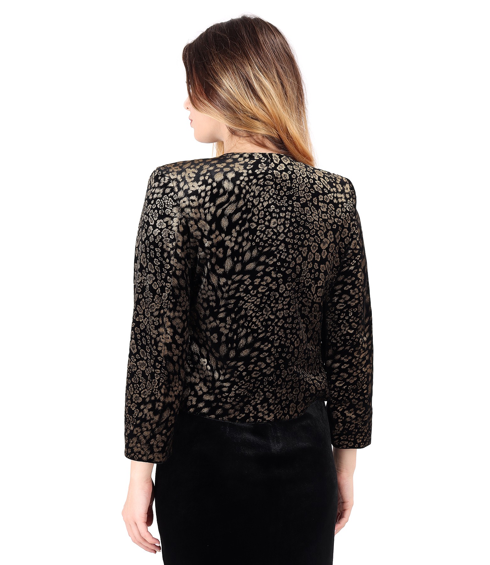 Bolero din catifea elastica imprimata cu motive aurii, captusit, cu maneci 3/4 si brosa detasabila la decolteu. Se inchide cu 2 capse mos-baba in partea superioara.