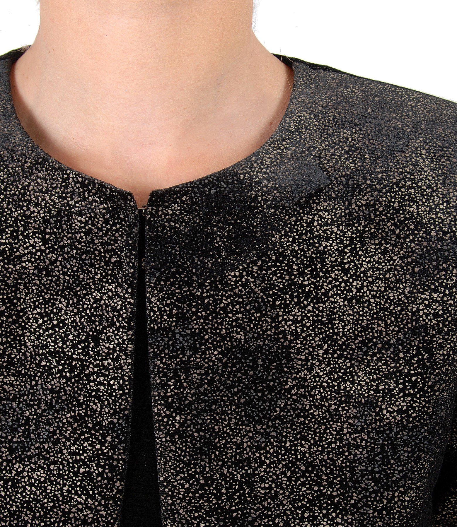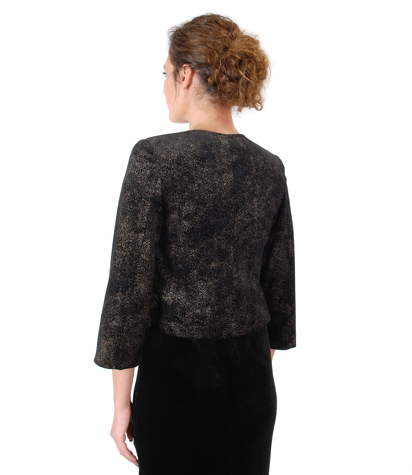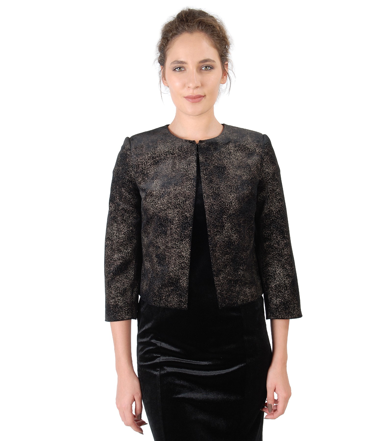 Bolero din catifea elastica imprimata cu motive aurii, captusit si cu maneci 3/4. Se inchide cu 2 capse mos-baba in partea superioara.
