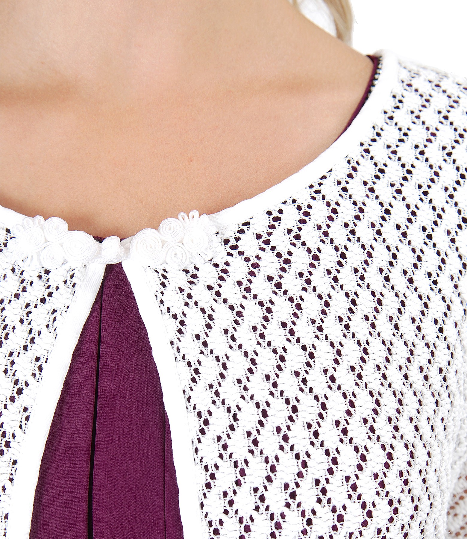 Bolero din dantela cu bumbac, cu maneci kimono 3/4. Se inchide pe fata cu un brandemburg in partea superioara.