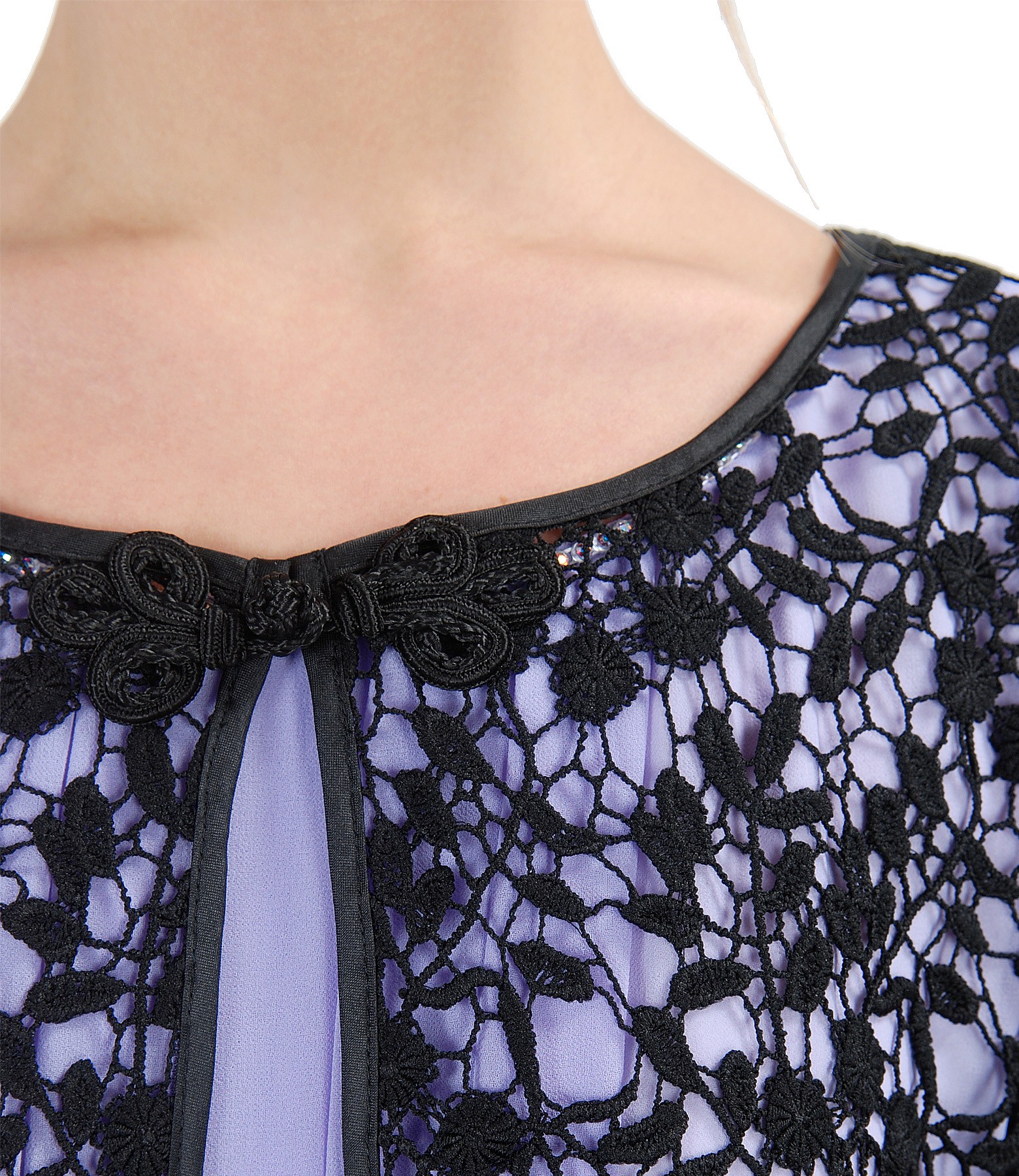 Bolero din dantela cu motive florale, cu maneci kimono 3/4. Se inchide pe fata cu un brandemburg in partea superioara.
