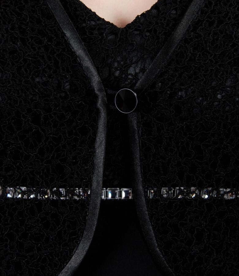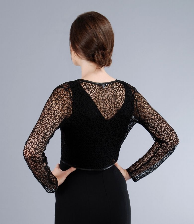 Bolero lejer din dantela elastica, cu maneci lungi, finisat cu garnitura in ton. Se inchide pe fata cu un nasture de cristal.