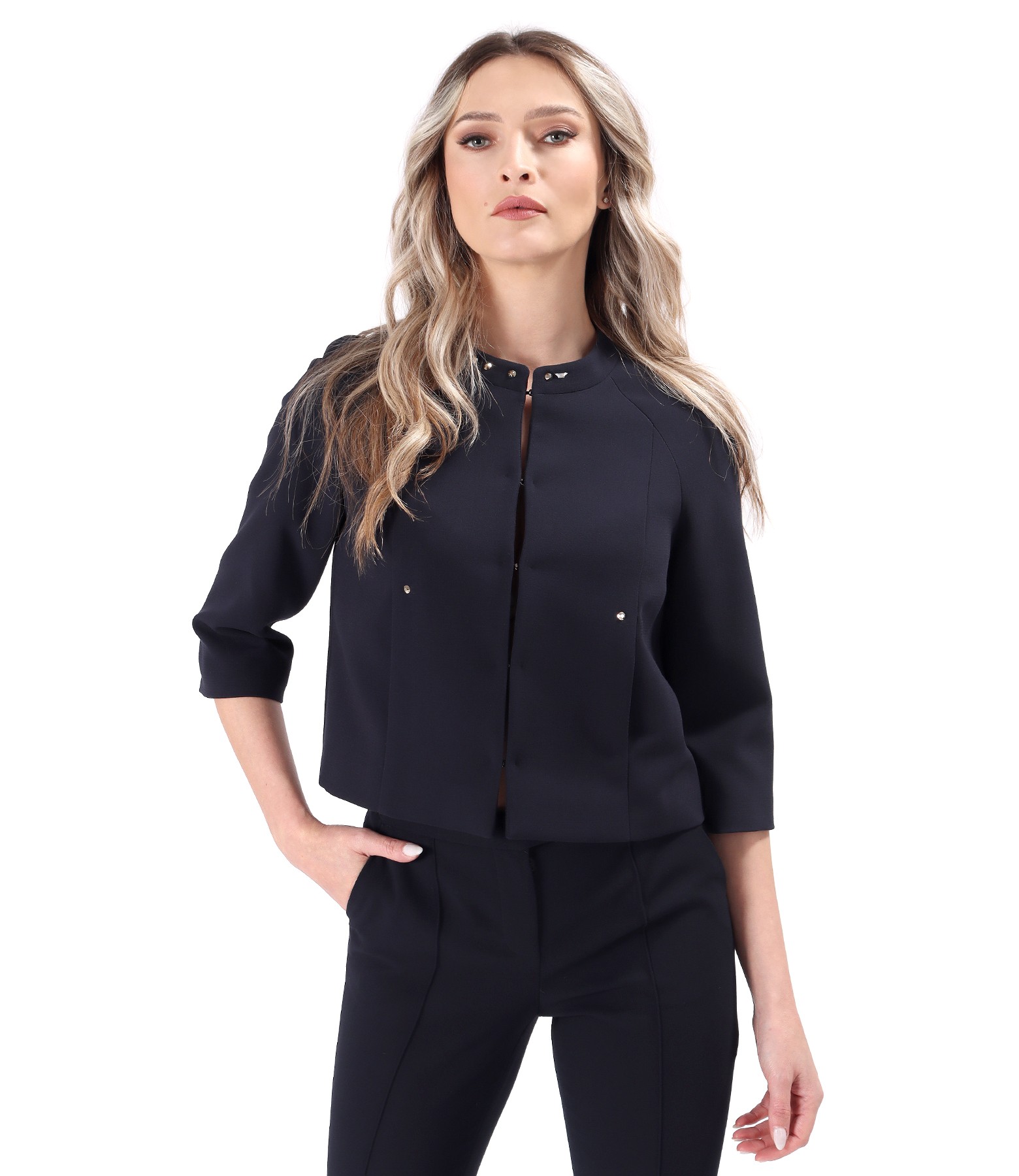 Bolero elegant cu maneci 3/4, captusit, cu buzunare verticale ascunse, guler gen tunica si aplicatie de cristale pe decolteu. Se inchide cu 5 perechi de capse mos baba pe fata.