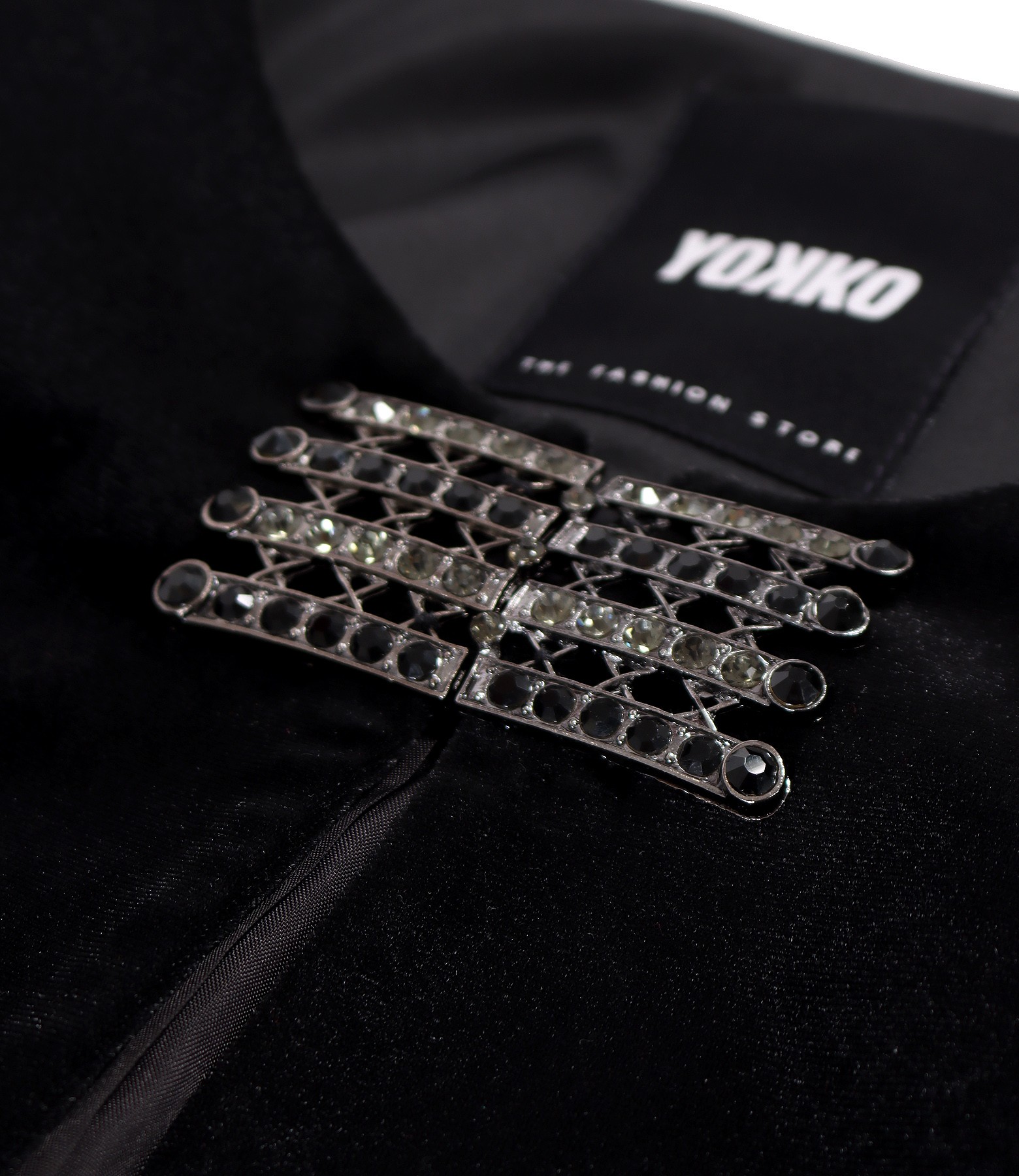 Bolero din catifea elastica neagra, captusit, cu maneci 3/4. Se inchide cu catarama metalica cu cristale stil mos-baba la decolteu.