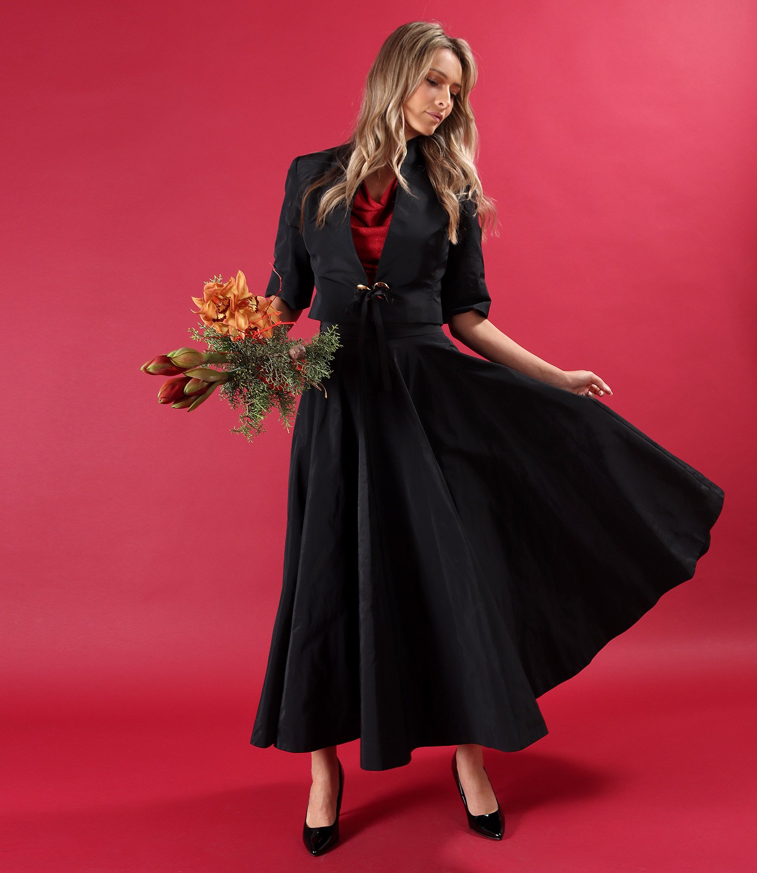 Bolero elegant din tafta usoara, cu efect mat, cu maneci 3/4 si guler gen tunica. Se inchide pe fata cu banda din rips.