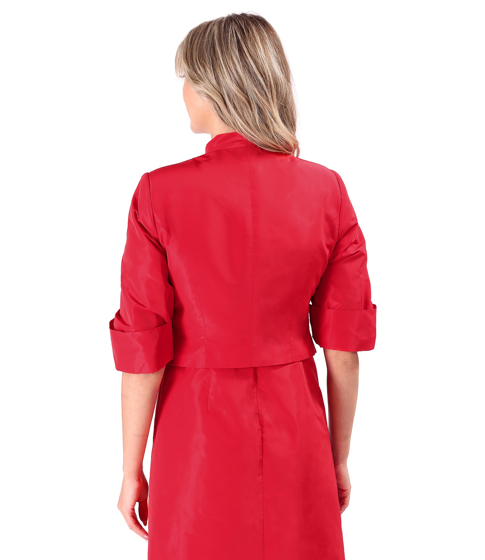 Bolero elegant din tafta usoara, cu efect mat, cu maneci 3/4 si guler gen tunica. Se inchide pe fata cu banda din rips.