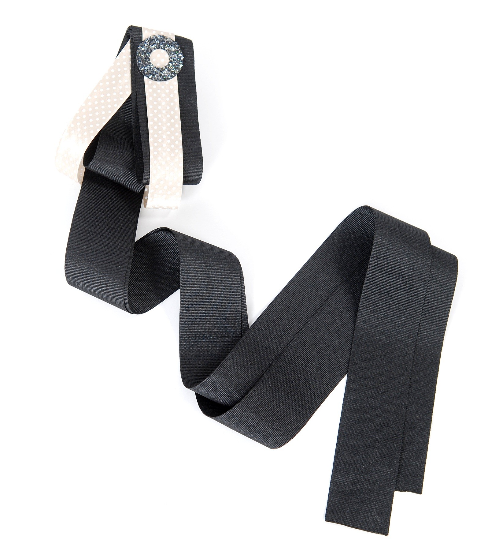 Brosa accesoriu din rips, cu garnitura cu buline si aplicatie de cristale. Se ataseaza in pozitia dorita cu un ac de siguranta.