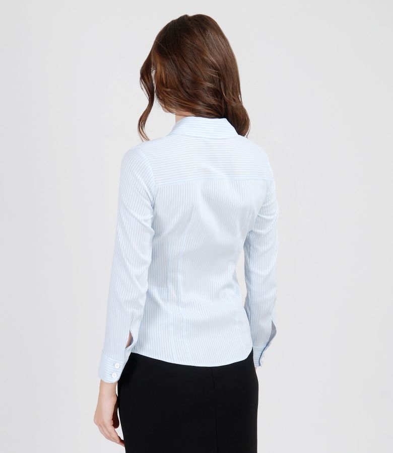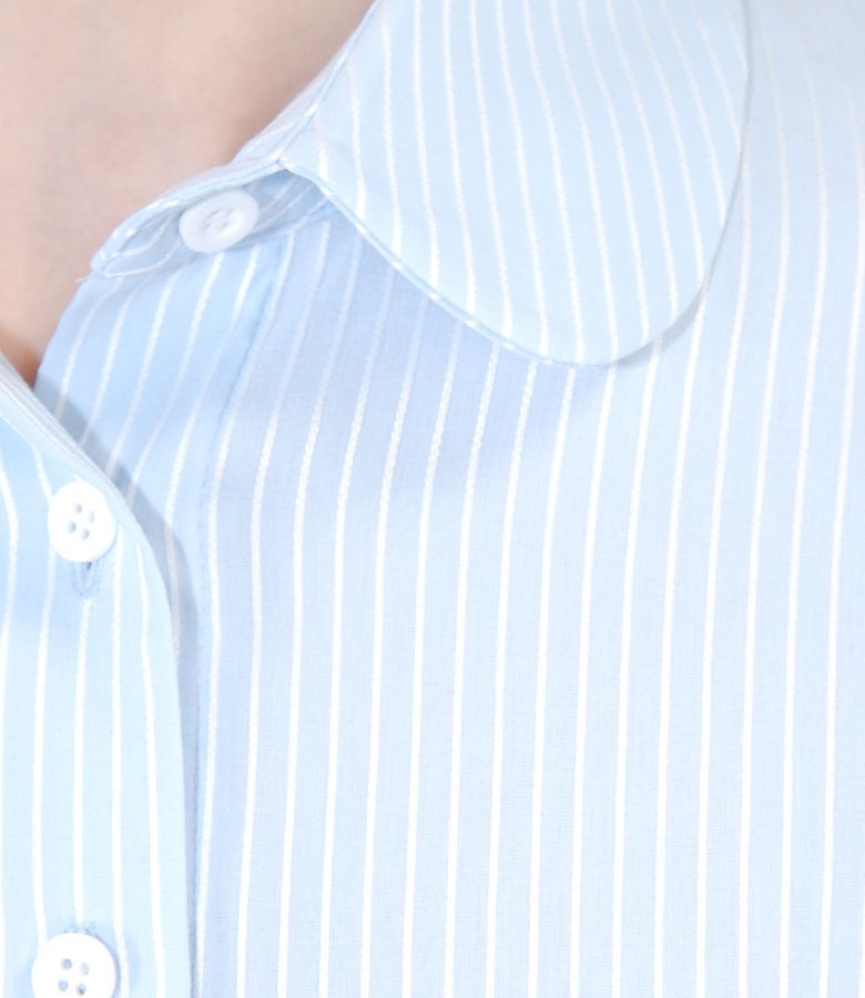 Camasa din bumbac elastic cu dungi, cu maneci lungi cu mansete. Se inchide pe fata cu 8 nasturi pana la baza gatului.