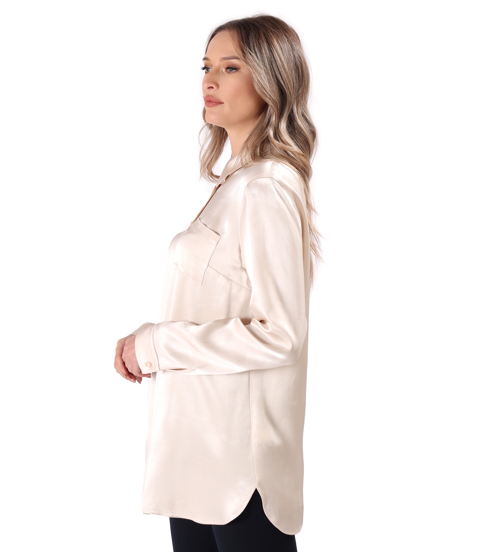 Camasa eleganta lejera din satin de viscoza, cu maneci lungi cu mansete si buzunar pe fata. Se inchide cu 8 nasturi pe mijloc fata.