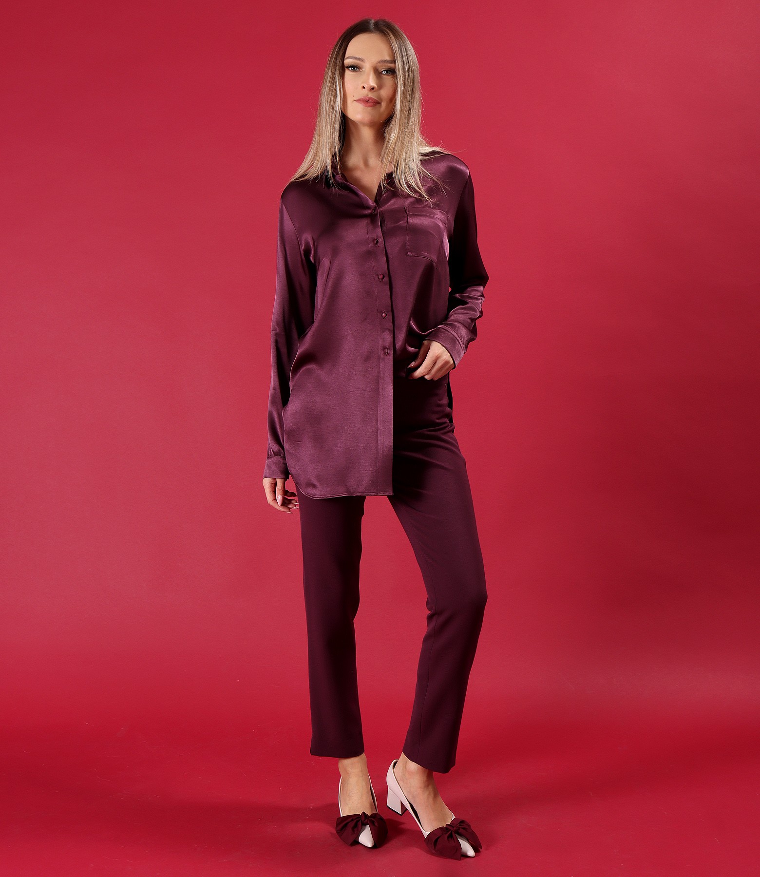 Camasa eleganta lejera din satin de viscoza, cu maneci lungi cu mansete si buzunar pe fata. Se inchide cu 8 nasturi pe mijloc fata.