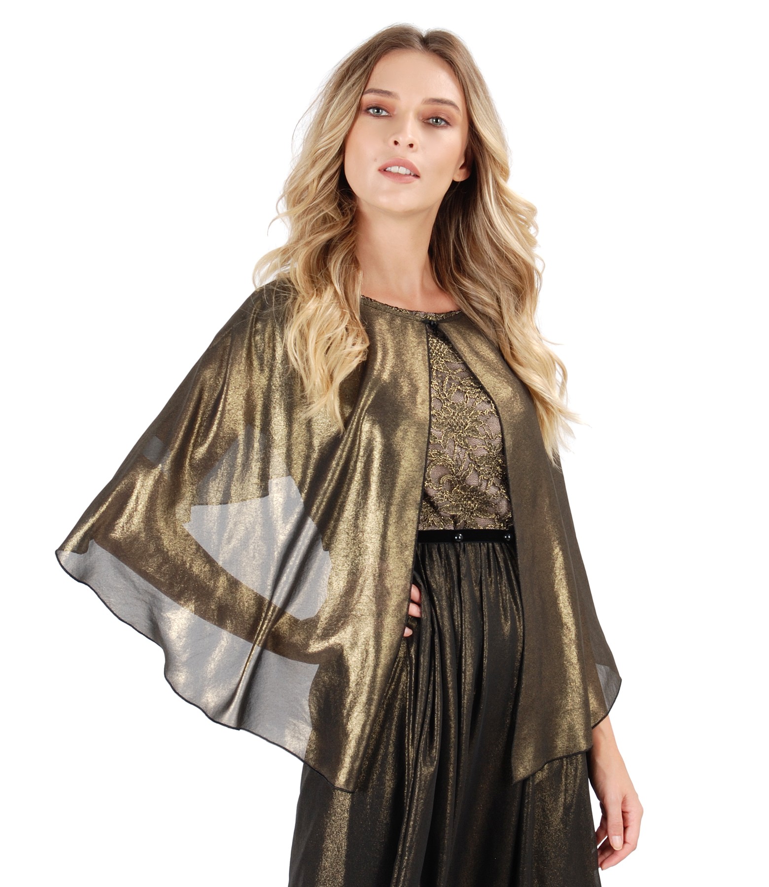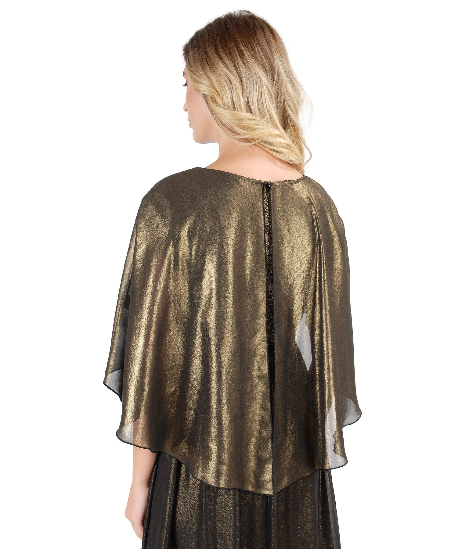 Capa din voal sidefat, cu decolteu rotund. Se inchide cu un nasture la spate.
