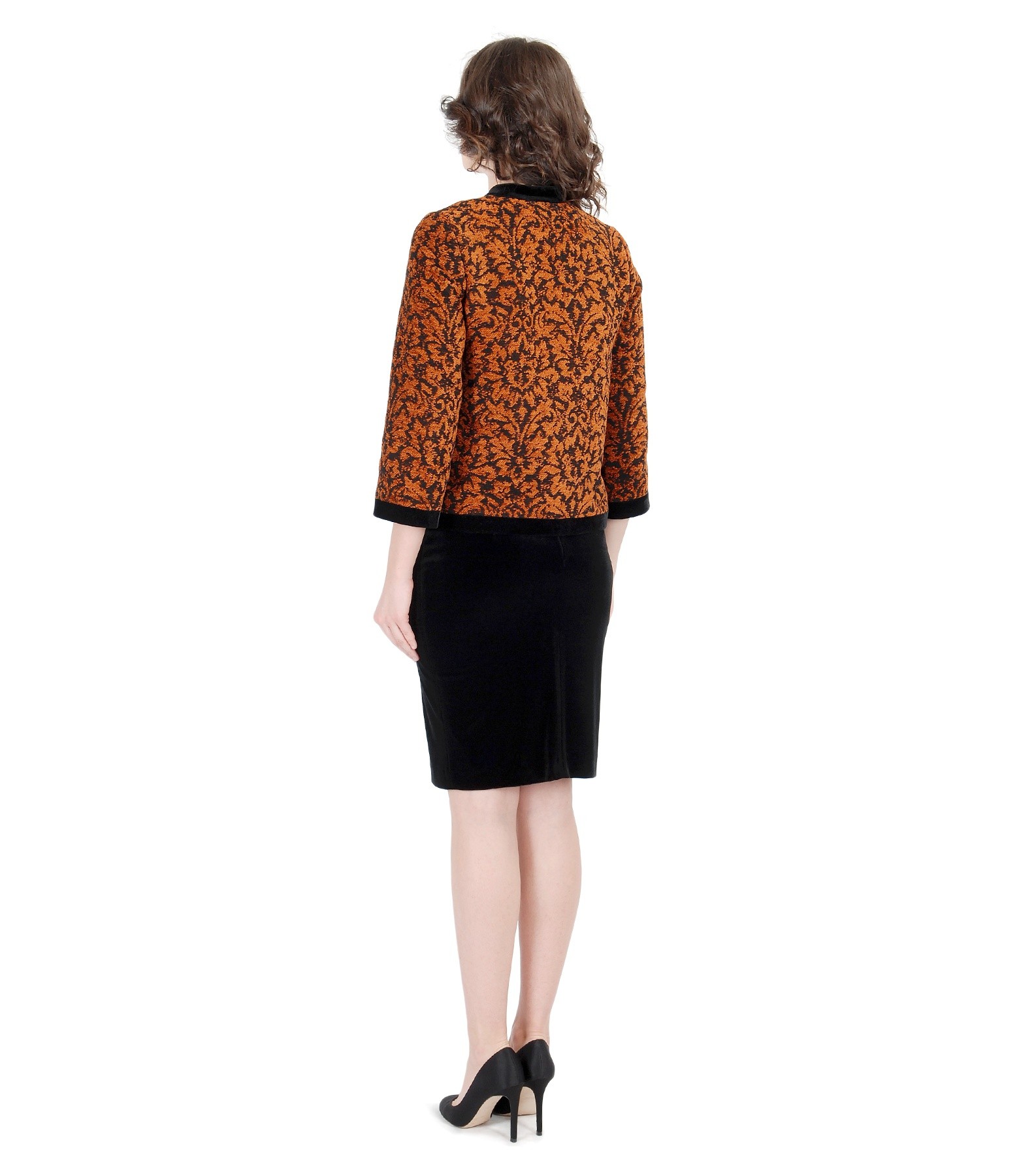 Sacou brocat cu motive florale de catifea cu lana, cu guler gen tunica, garnitura de catifea si buzunare verticale ascunse.